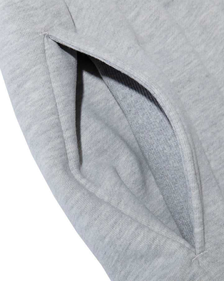 The sweatshirt has pockets under the arms, and the pants have been updated with a new silhouette that is a little baggy. The fleece lining is soft to the touch and makes it comfortable to wear.