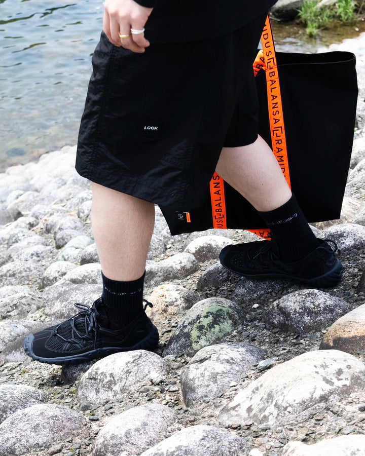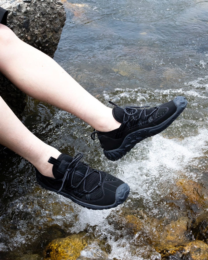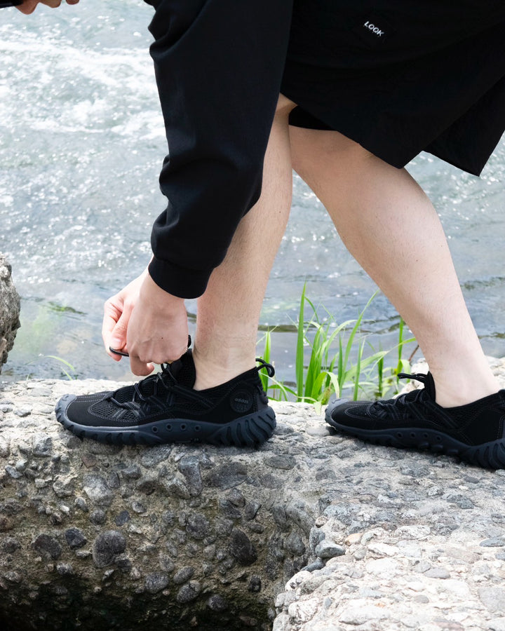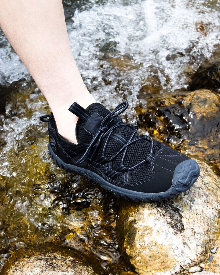 The mesh upper and synthetic panels combine to provide durability in wet environments, while the heel and collar have deep cuts to make them easy to put on and take off as slip-ons. In addition, a three-line nylon webbing tape is used as the shoelace system to provide a firm hold on the instep.