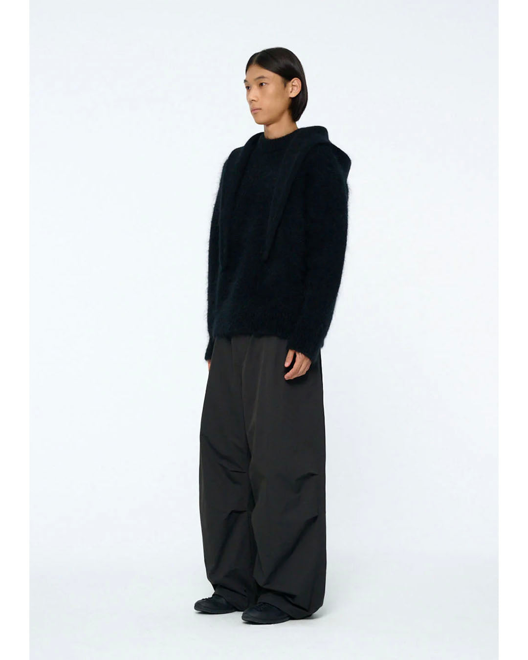 柔らかくヘアリーな質感のニットプルオーバーです。モヘアとウールの混紡糸で作られており、優れた保温性を提供します。表面にはブラシでヘアリーなテクスチャーを施し、暖かみのある雰囲気を演出します。少し高めのモックネックが安定感のあるネックラインを完成させ、ネック・袖・裾はしっかりとしたリブ編みで仕上げ、シルエットの完成度を高めています。ゆったりとした丈感とオーバーサイズのシルエットで、体型を気にせず快適に着用できるアイテムです。