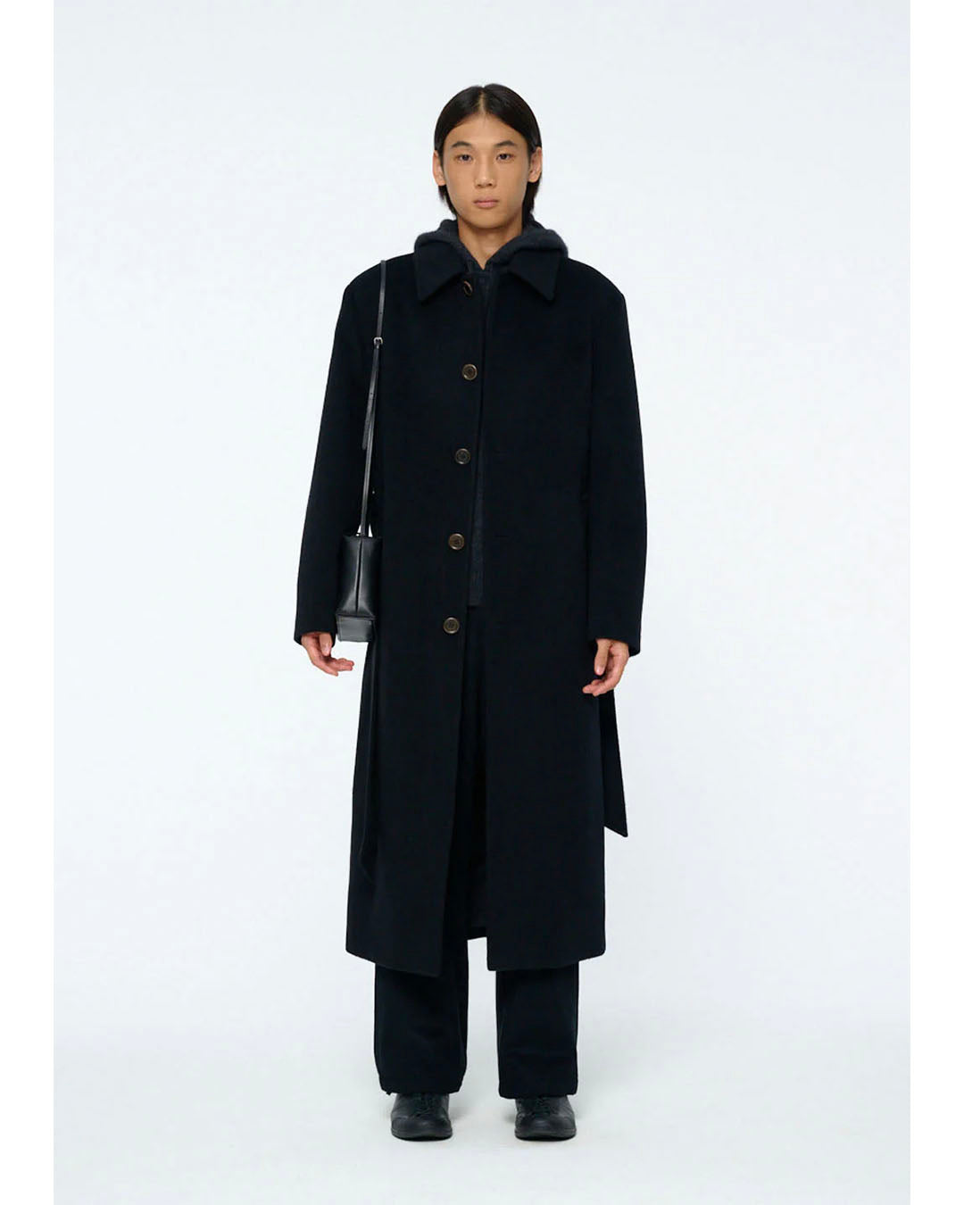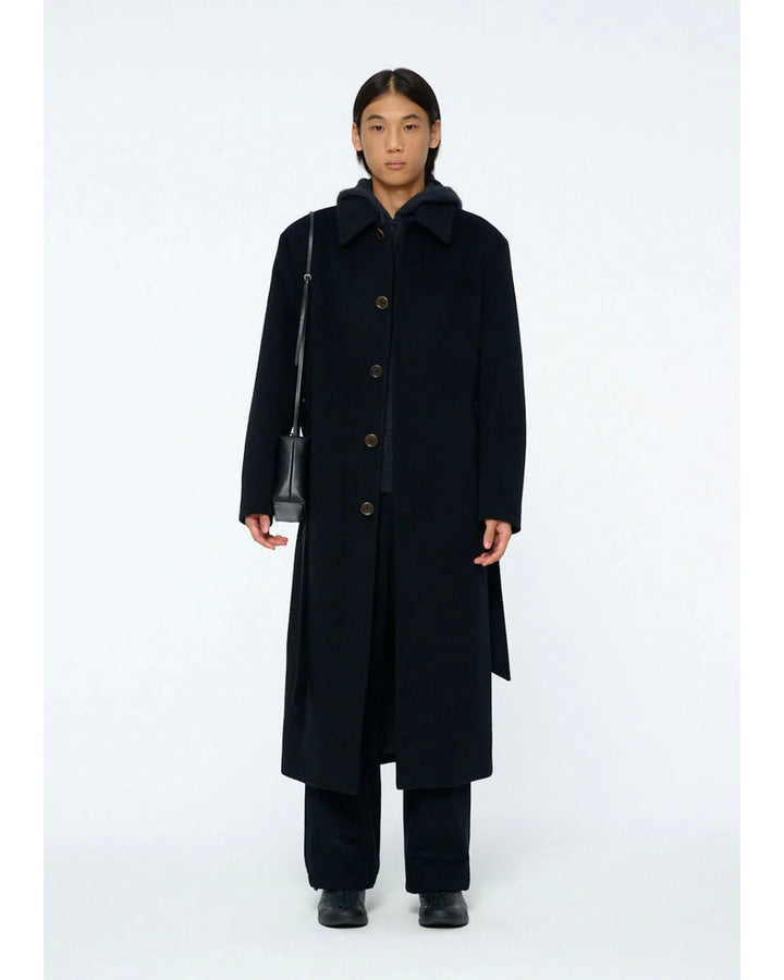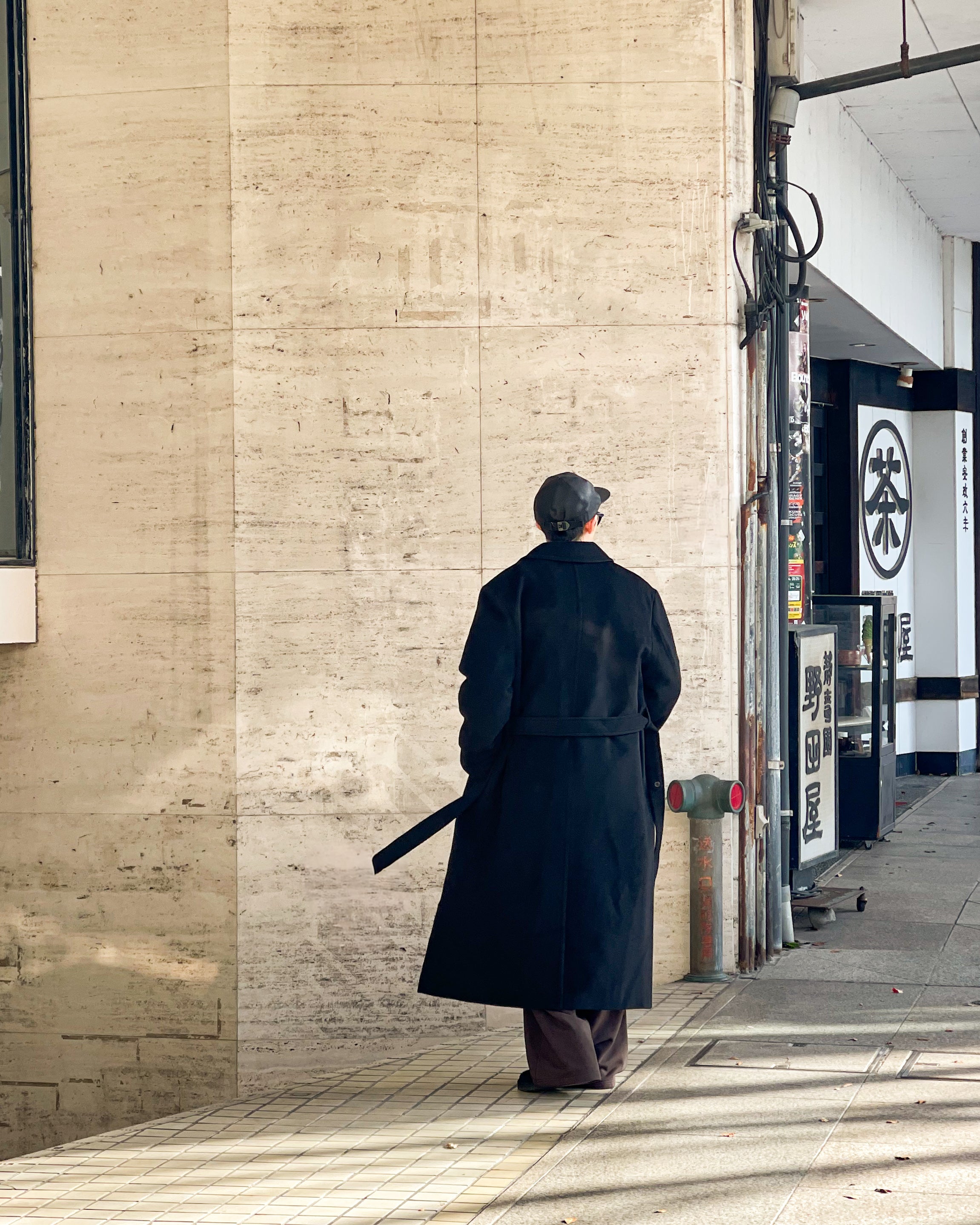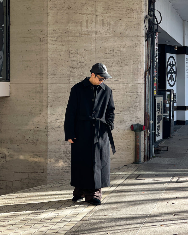 ゆったりとしたHラインシルエットのロングコートです。ウール混紡の密度感ある素材で高級感を演出し、余裕のある肩ラインとストレートフィットで構造的なシルエットを完成させました。取り外し可能なウエストベルトと収納に便利な内ポケットで実用性を高めました。両サイドポケットとディープブラウンカラーのナットボタンのクロージングで完成度を高めたアイテムです。