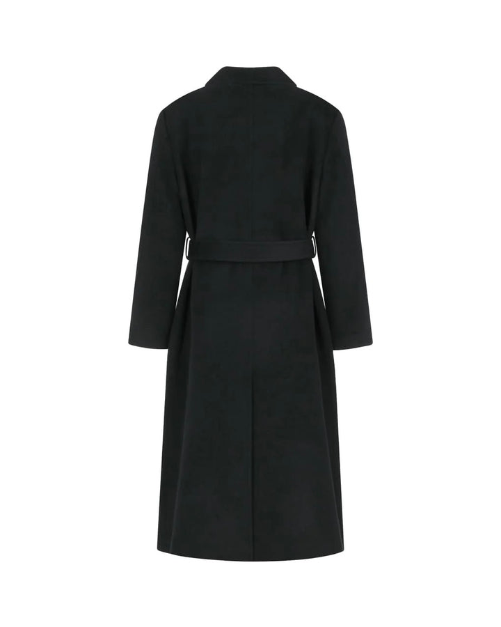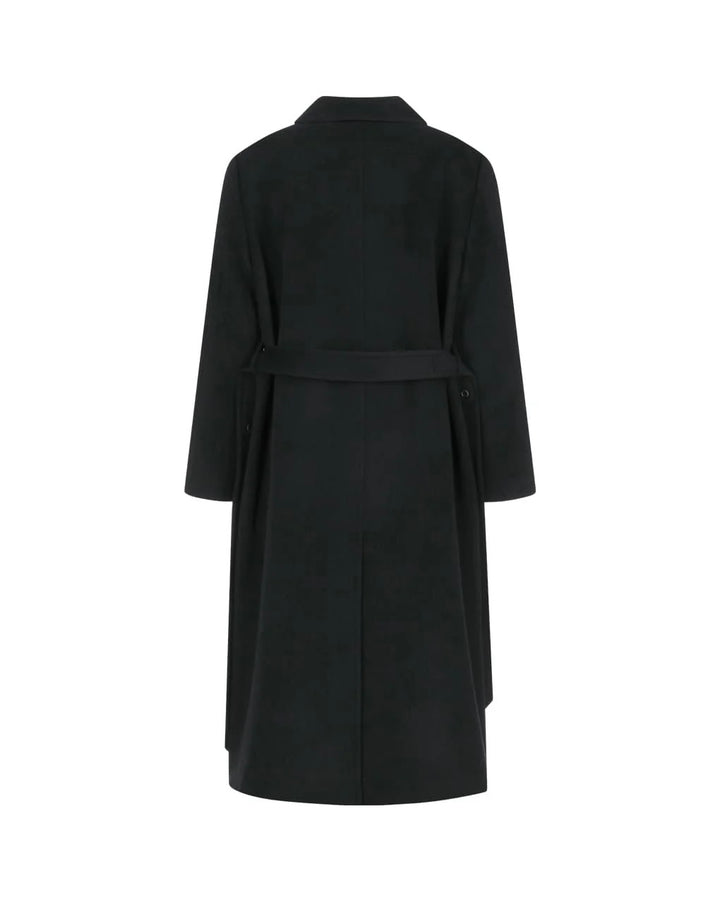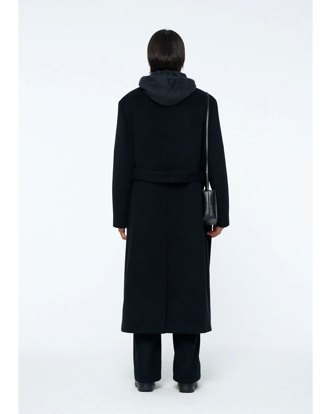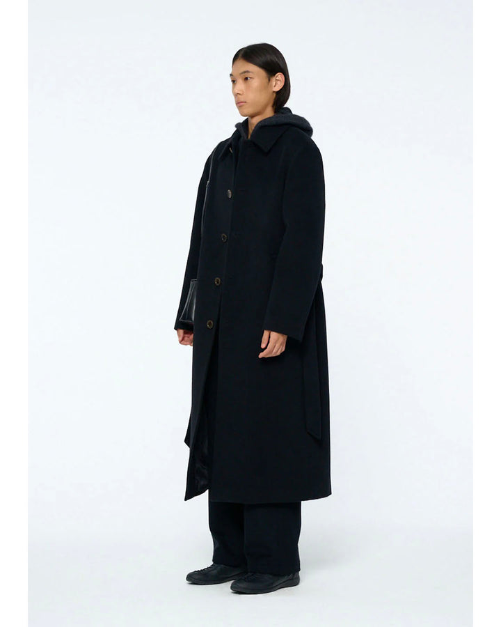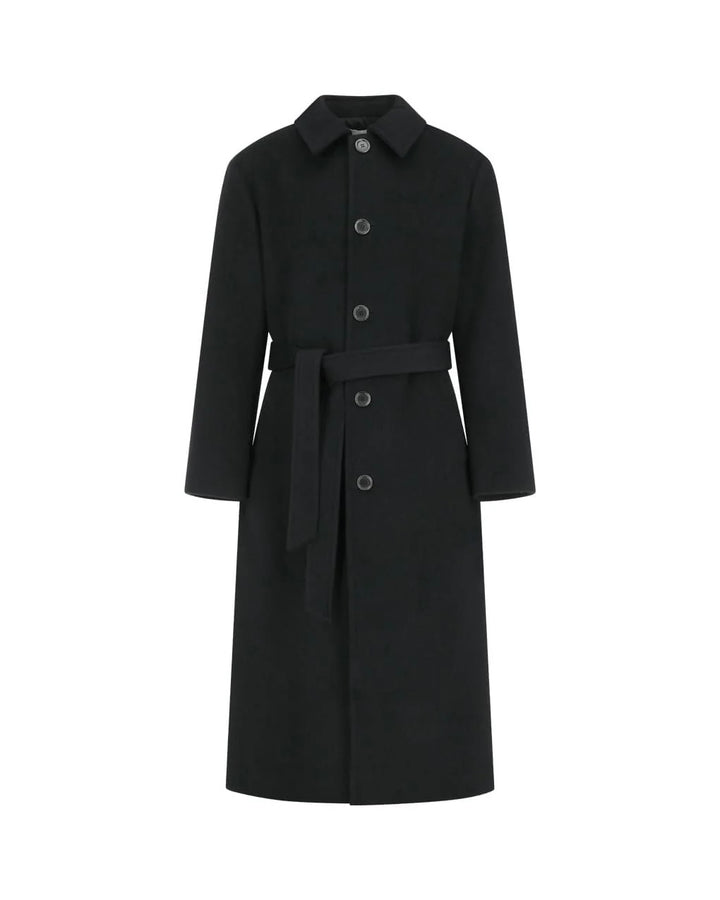 ゆったりとしたHラインシルエットのロングコートです。ウール混紡の密度感ある素材で高級感を演出し、余裕のある肩ラインとストレートフィットで構造的なシルエットを完成させました。取り外し可能なウエストベルトと収納に便利な内ポケットで実用性を高めました。両サイドポケットとディープブラウンカラーのナットボタンのクロージングで完成度を高めたアイテムです。