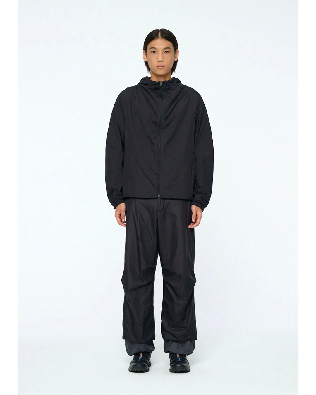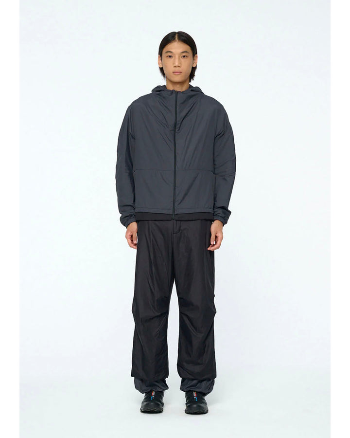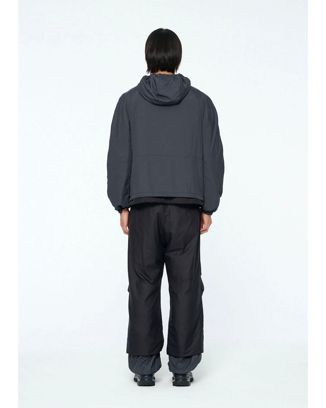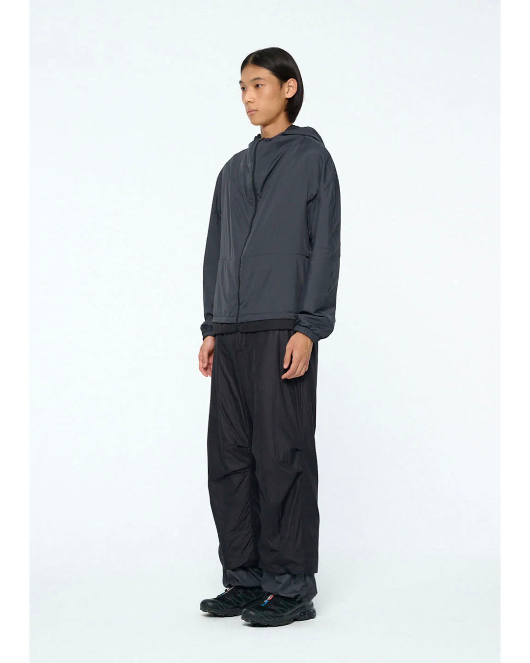 ナイロン素材のリバーシブルフードジップアップジャンパーです。ナイロン素材と1オンスの綿を使用しており、軽量で保温性があり、季節の変わり目や冬の時期に活躍します。直線的でありながらラウンドした肩のシルエットが特徴です。ミニマルな切り替えとコンシールファスナーを使用し、スポーティーなムードを演出します。リバーシブルで着用可能で、表と裏のカラーコントラストがポイントになります。内側の裾のストリングストッパーを調整することで、下からの冷気を防ぐことができ、袖口のバンディング処理で快適な着心地を提供します。