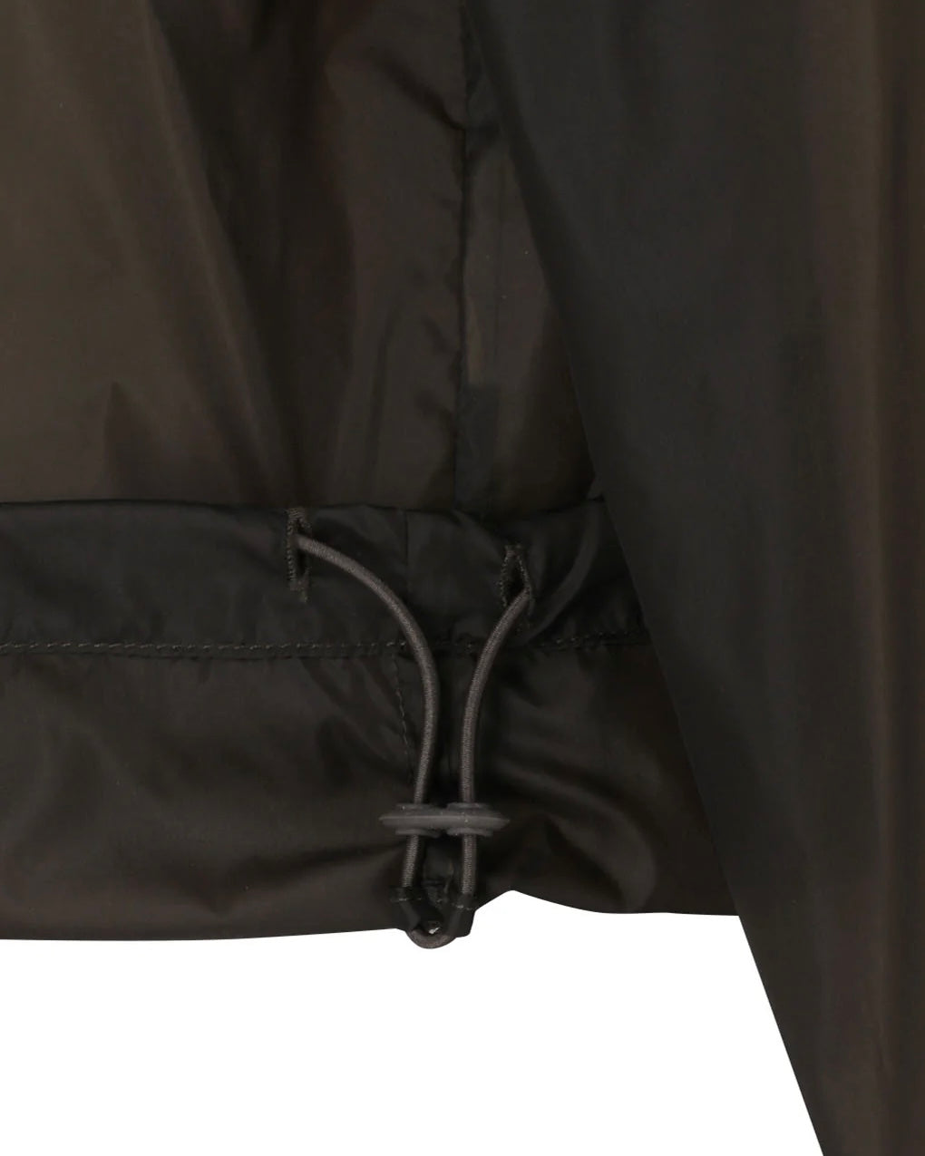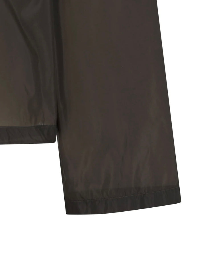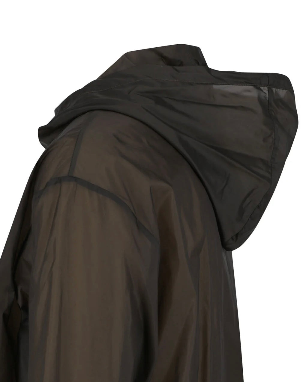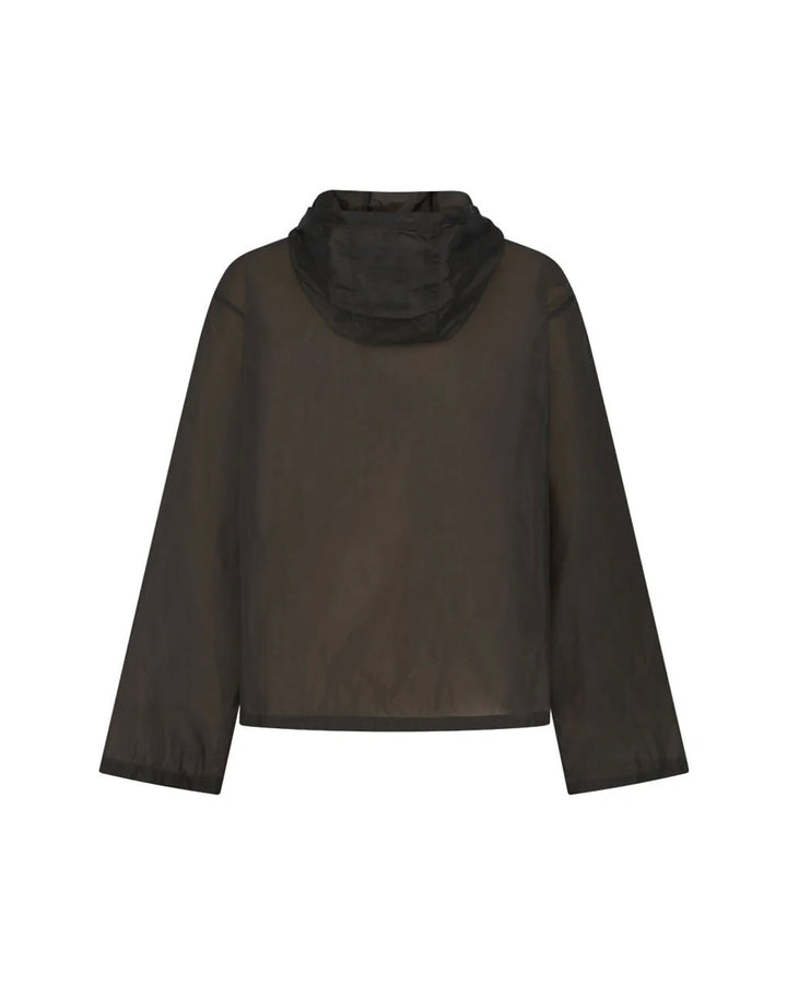 A hooded anorak made of sheer nylon material.