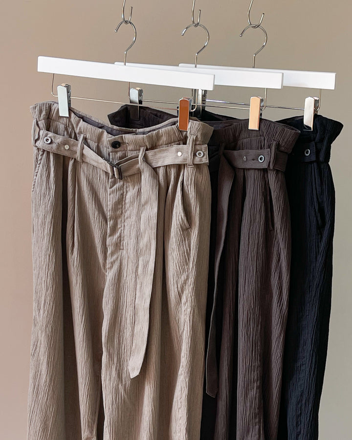 These wide-silhouette slacks are generously cut to highlight the texture of the fabric, and come with a matching fabric belt as an accent. (It is removable, so you can also wear a regular belt.) They sway beautifully with the wind as you walk.