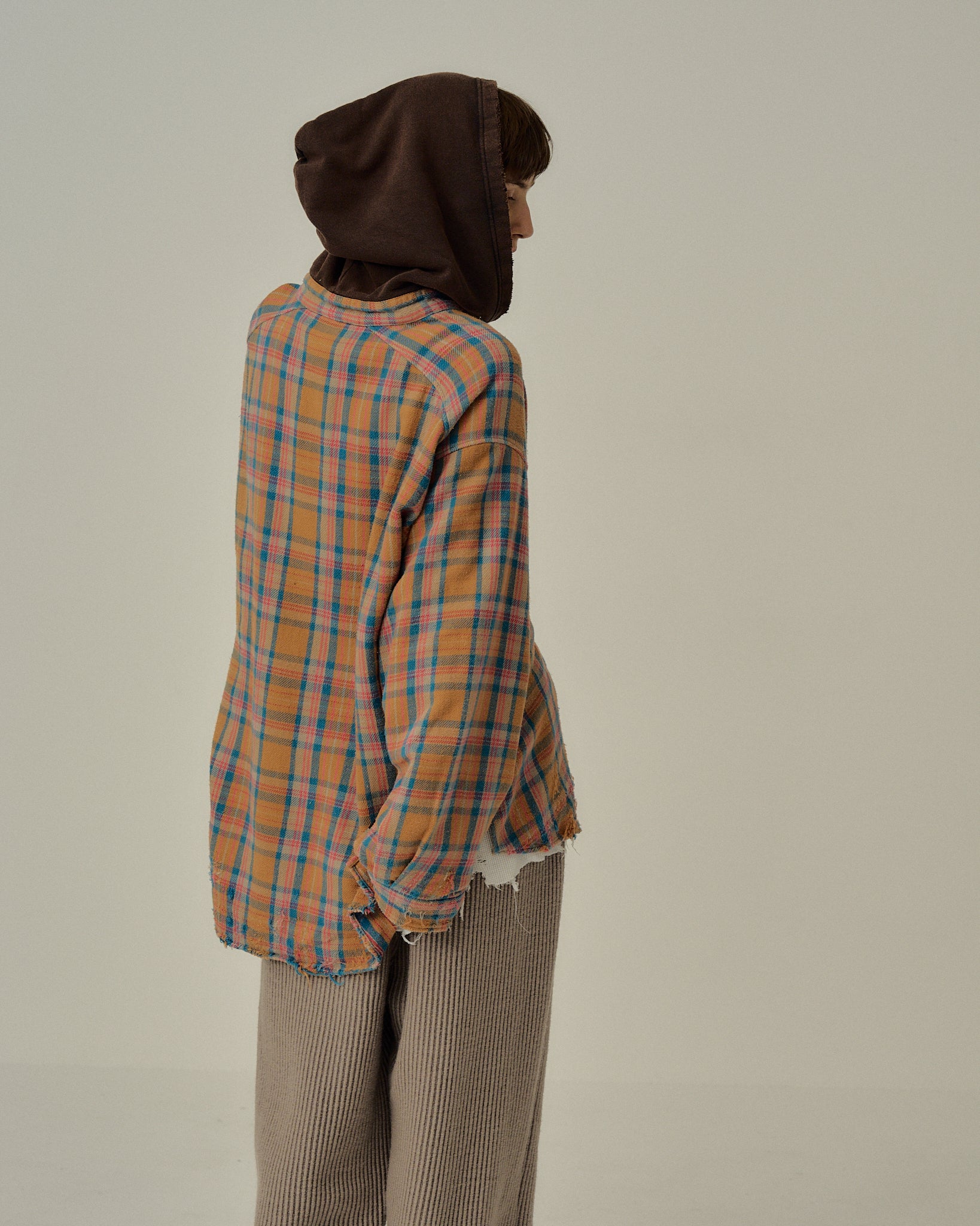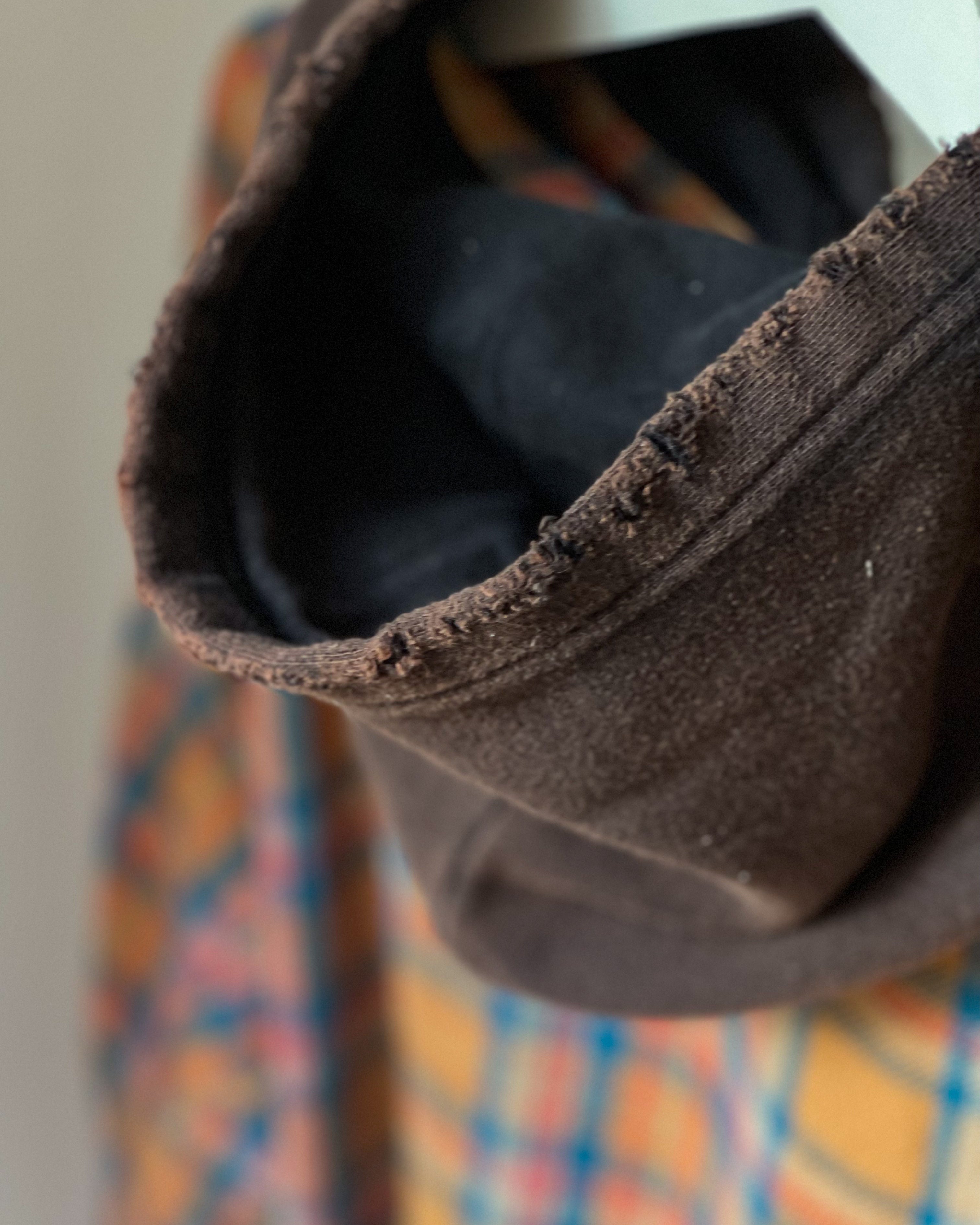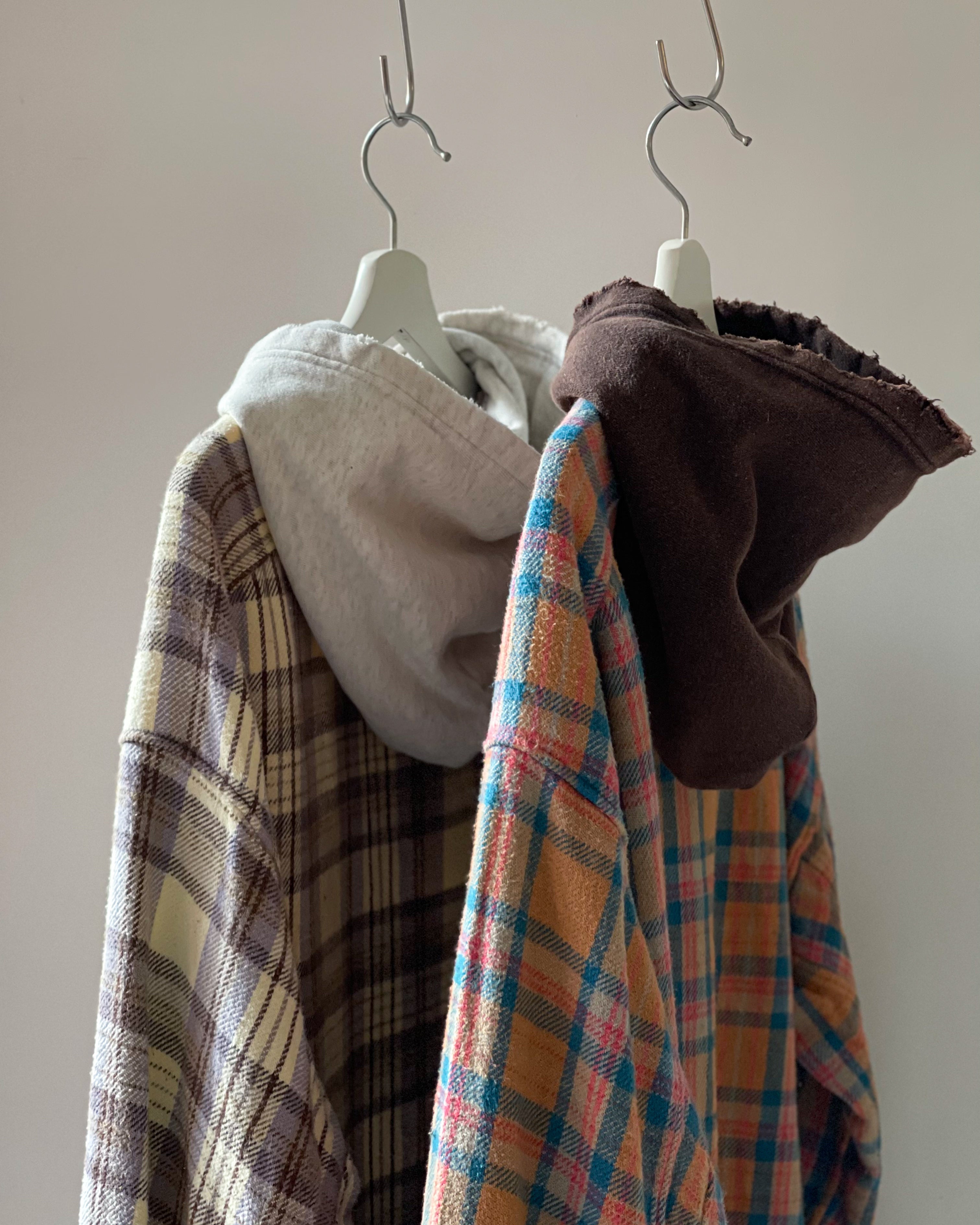 カラーもありそうでなかった色を掛け合わせ、ミリ単位でチェックの大きさを調整しており、他では見つからない雰囲気の一着になってます。IVORYにはASH、CAMELにはBLACKのフーディーを合わせており、フードを被った際に外側を中心にエイジングした事をイメージしたような加工もストーリーを感じます。