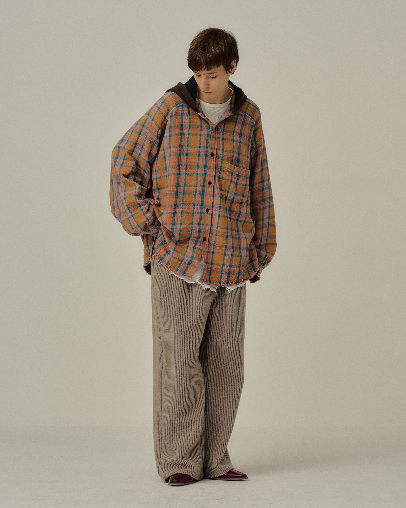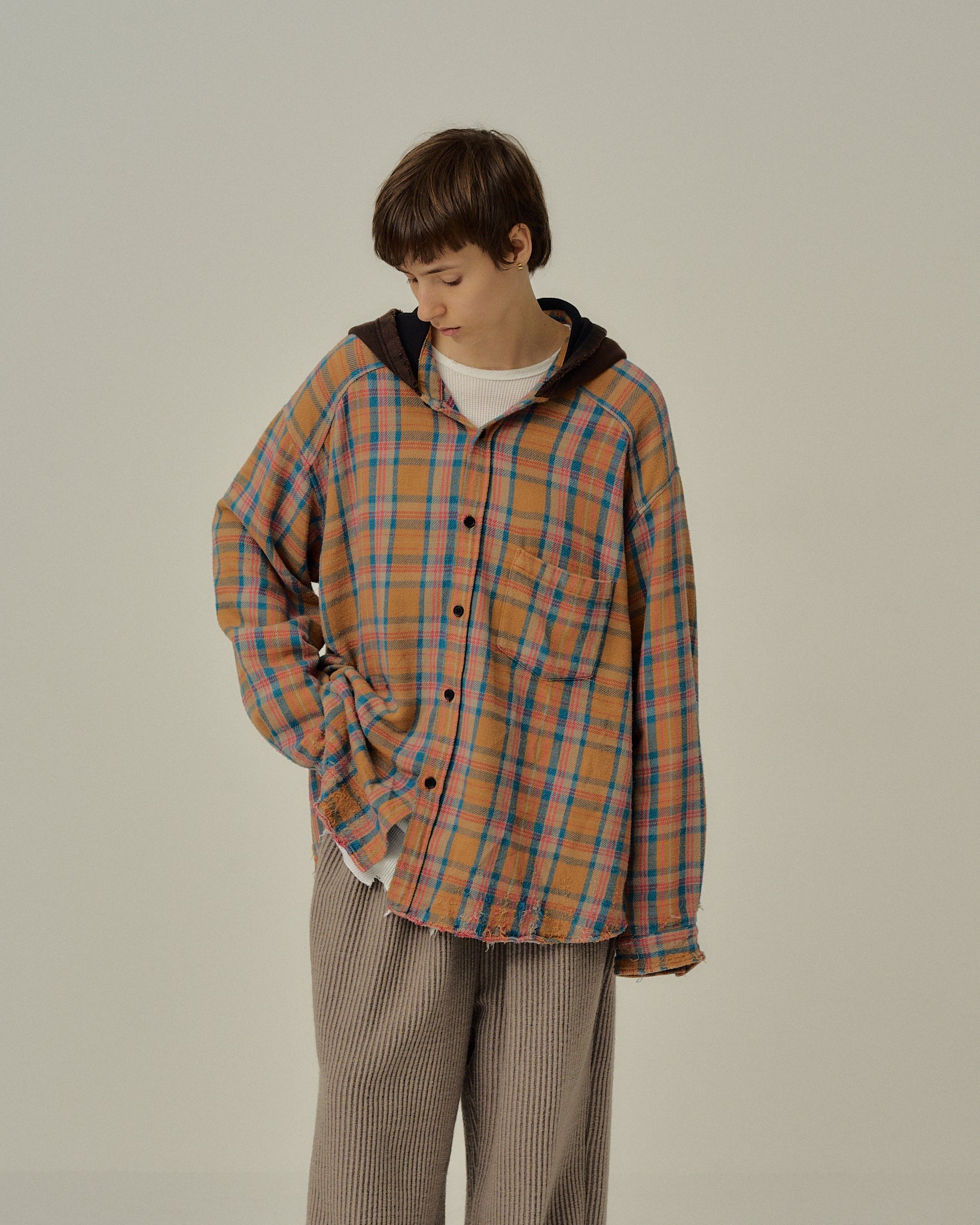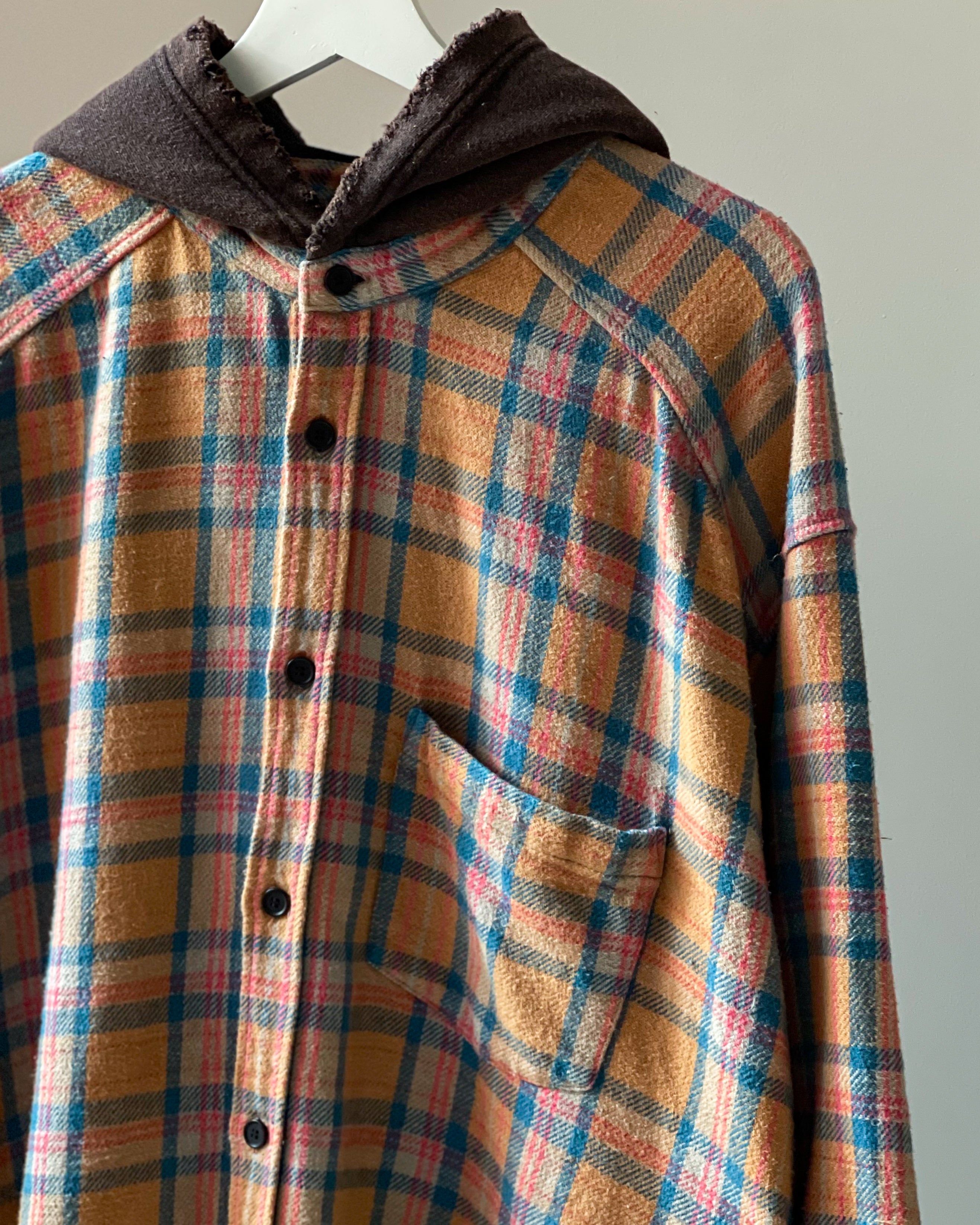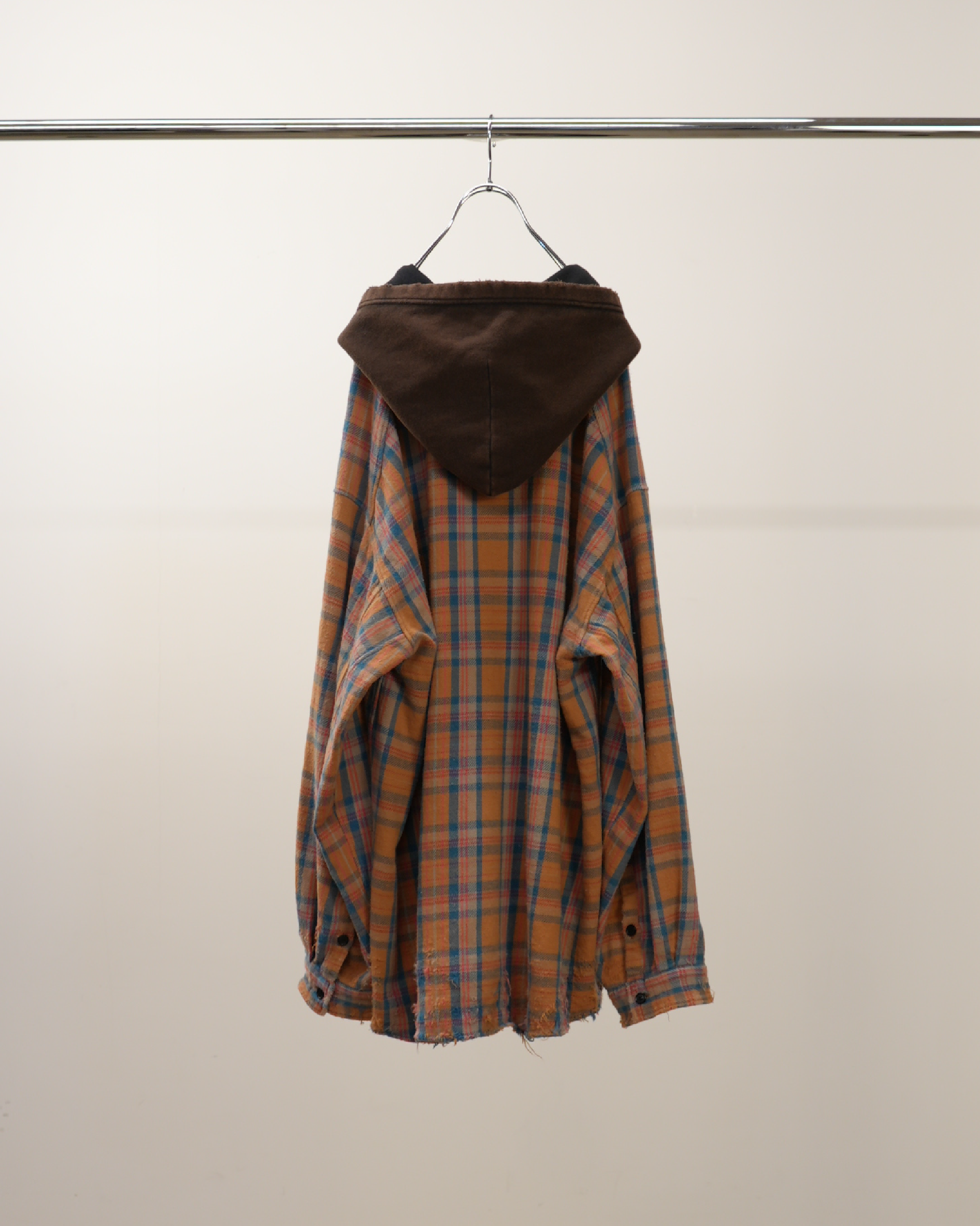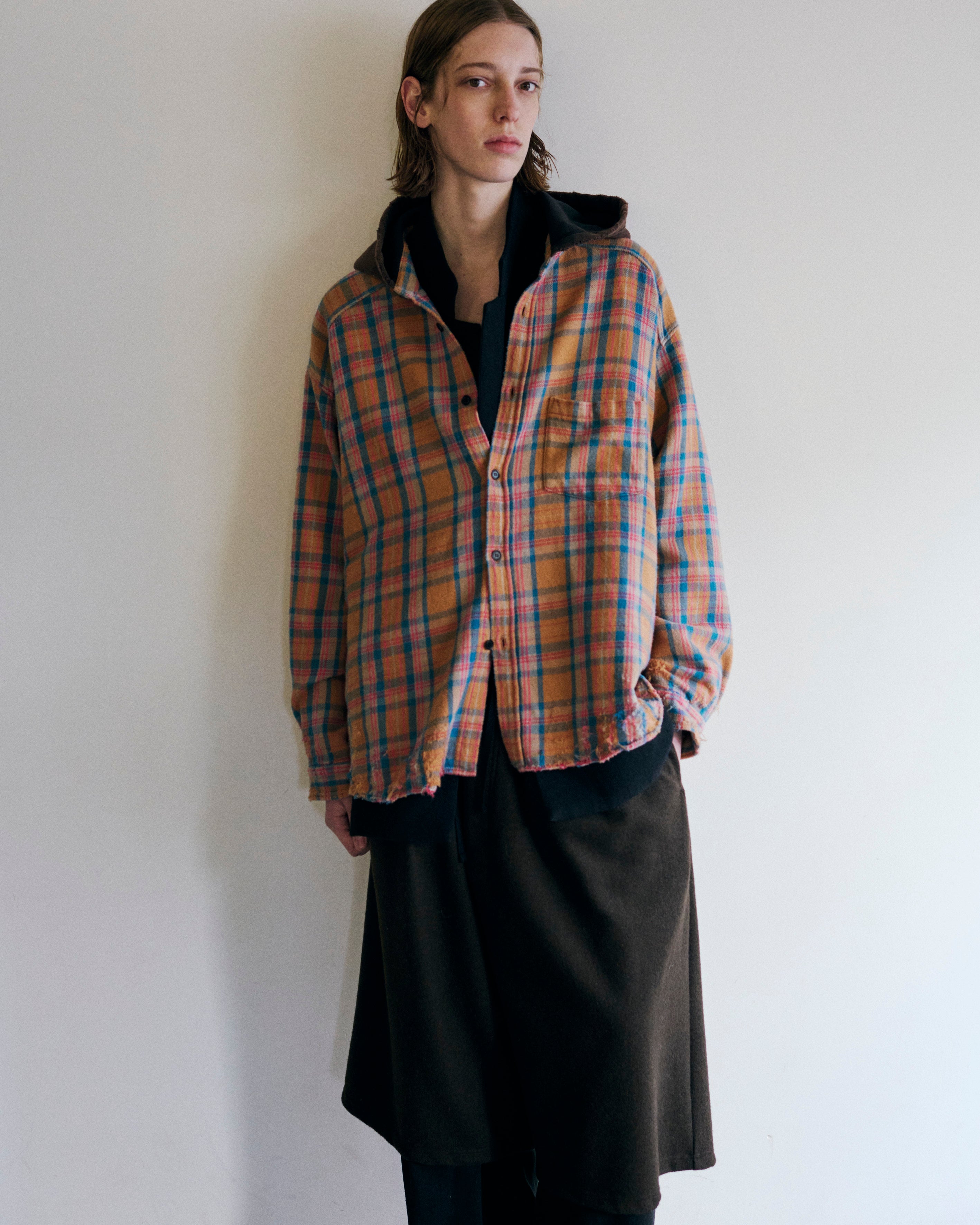 スウェットフーディーの上からネルシャツを重ねたように見えるフェイクレイヤードのフーディーシャツ。LOOKを見た時はもちろん、展示会で試着した時に、これだと思った一着です。