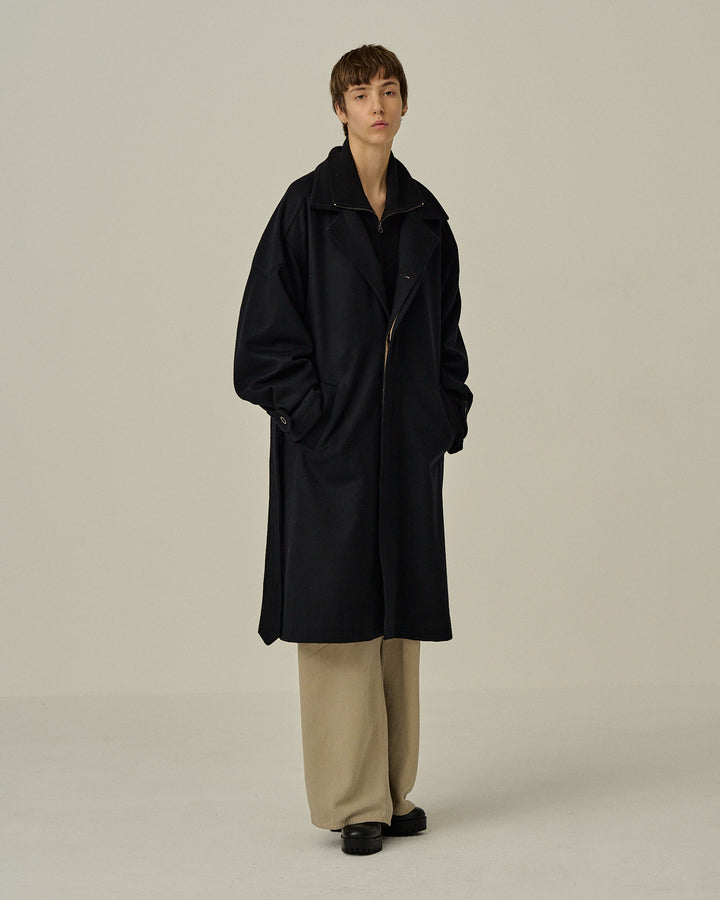This Balmacaan coat is crafted from a luxurious blend of wool, silk, and cashmere. However, to avoid looking too elegant, the fabric is intentionally left on the inside, giving the coat a strong, textured, and slightly rough feel.