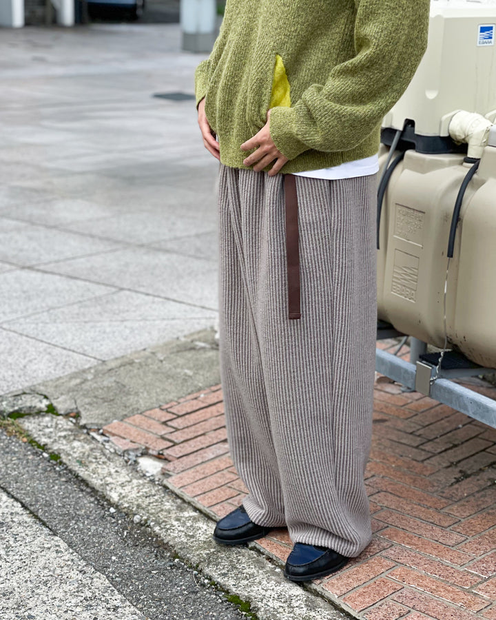 The fabric is knitted to give it a soft feel and a beautiful drape. The color is then adjusted through processing to create a warm atmosphere. It doesn't have the stiff feel that is often found in thick corduroy, and is extremely comfortable to wear.
