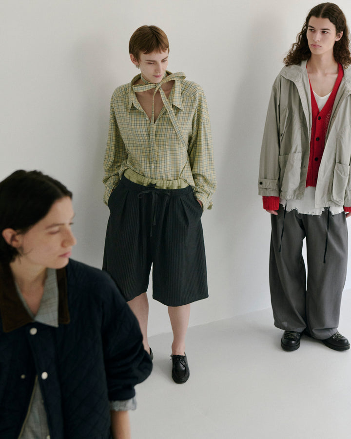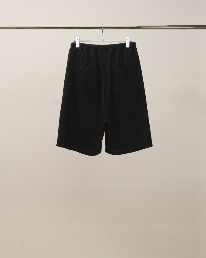 The design is simple, with the ridges resembling stripes, and the three-dimensional fabric has a strong presence. The easy shorts have an external drawcord and a deep tuck in the front, creating a beautiful shadow effect with rich draping.