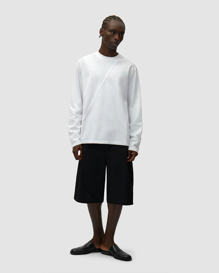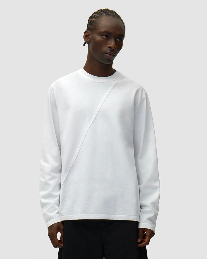 This long-sleeved T-shirt features a bold print of this season's collection's key graphic on the back. It also features a stitching design that divides the entire body diagonally. Made from high-quality heavyweight cotton, this piece has a moderately relaxed fit.