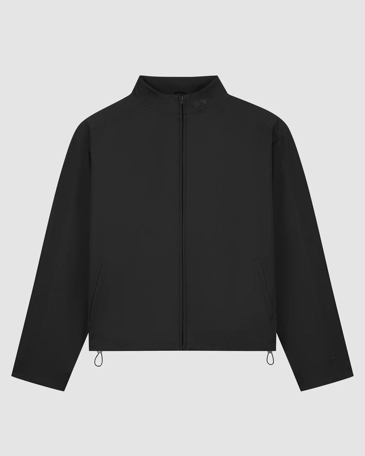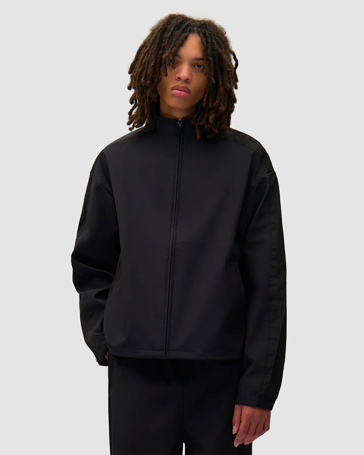 This track jacket features a simple design with a stand-up collar, a front zip closure, an adjustable drawstring at the hem, and a small rubber logo on the left side of the collar.