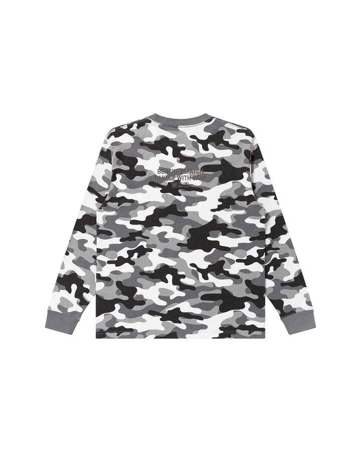 A long-sleeved T-shirt with a monochrome camouflage print on the body, a "Handle with Care" graphic patch, and an "HWC" graphic embroidered on the back.