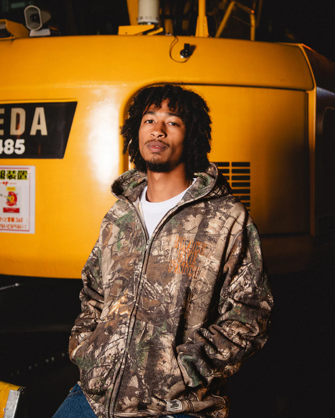 An all-over print sweat zip hoodie with a real tree pattern and an army stencil-style brand logo embroidered on the front and back.