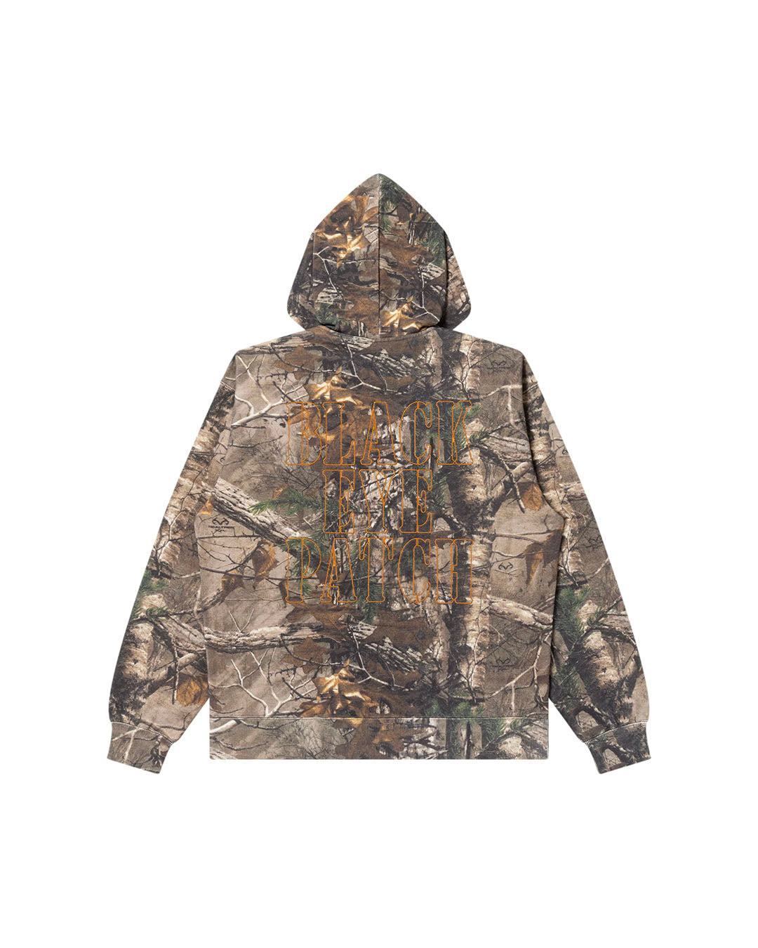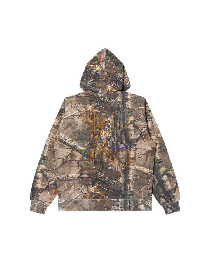 A 12.5oz all-over sweatshirt zip hoodie featuring real tree pattern print with army stencil style brand logo embroidered on the front and back.