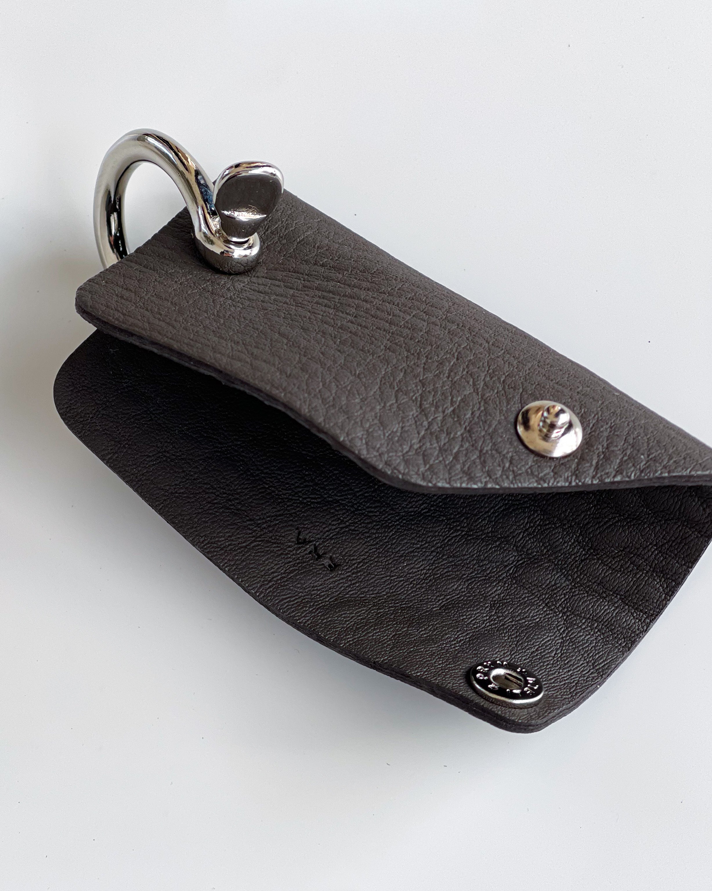 This is an upgraded version of IRA's classic shackle key cover, which can hold up to four keys . The front and back are made of leather for added durability and elegance .