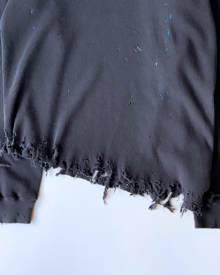 The signature details of the asymmetrical cut at the hem and the hand-made distressing using a grinder remain, while the design is balanced with a refined appearance, including a slanted collar in the front, three-dimensional two-piece sleeves, and ribbed sleeves.