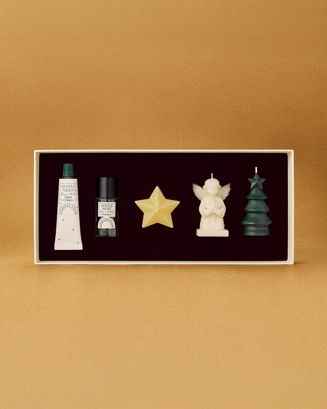 The limited-edition Gentle Night Holiday Set includes a 10mL eau de parfum and a 15mL mini hand cream in the scent of the nonfiction bestseller Gentle Night, as well as three decorative candles. The candles, featuring a Christmas tree, angel, and star motif, are scented with Christmas tree, sweet vanilla, and evening rum, respectively, to create a special holiday mood. The three scents blend together to enrich your end-of-year celebrations: refreshing Christmas tree, warm and sweet vanilla, and gorgeous evening rum, reminiscent of a holiday cocktail.
