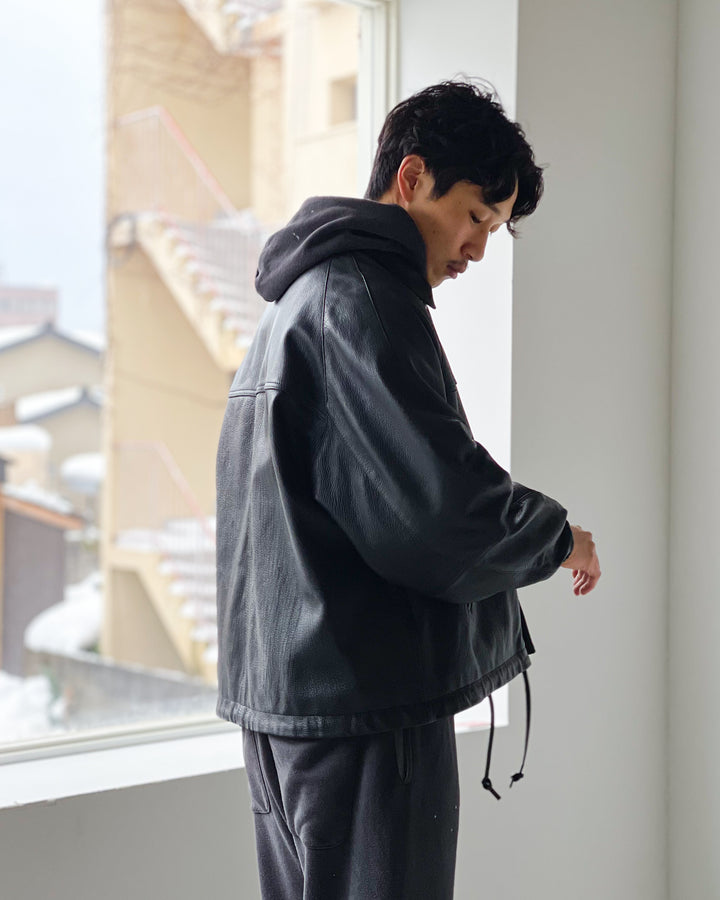 This is the second collaboration with leather brand CCU. This piece combines a work jacket and a dress jacket. The image is inspired by a woven jacket worn by a site supervisor, which was found among vintage documents. The leather is made of aniline-finished goat leather. The more you use it, the more it will age and develop a deeper character. The hem can be adjusted with a drawcord made of the same material. The leather buttons are a distinctive feature.