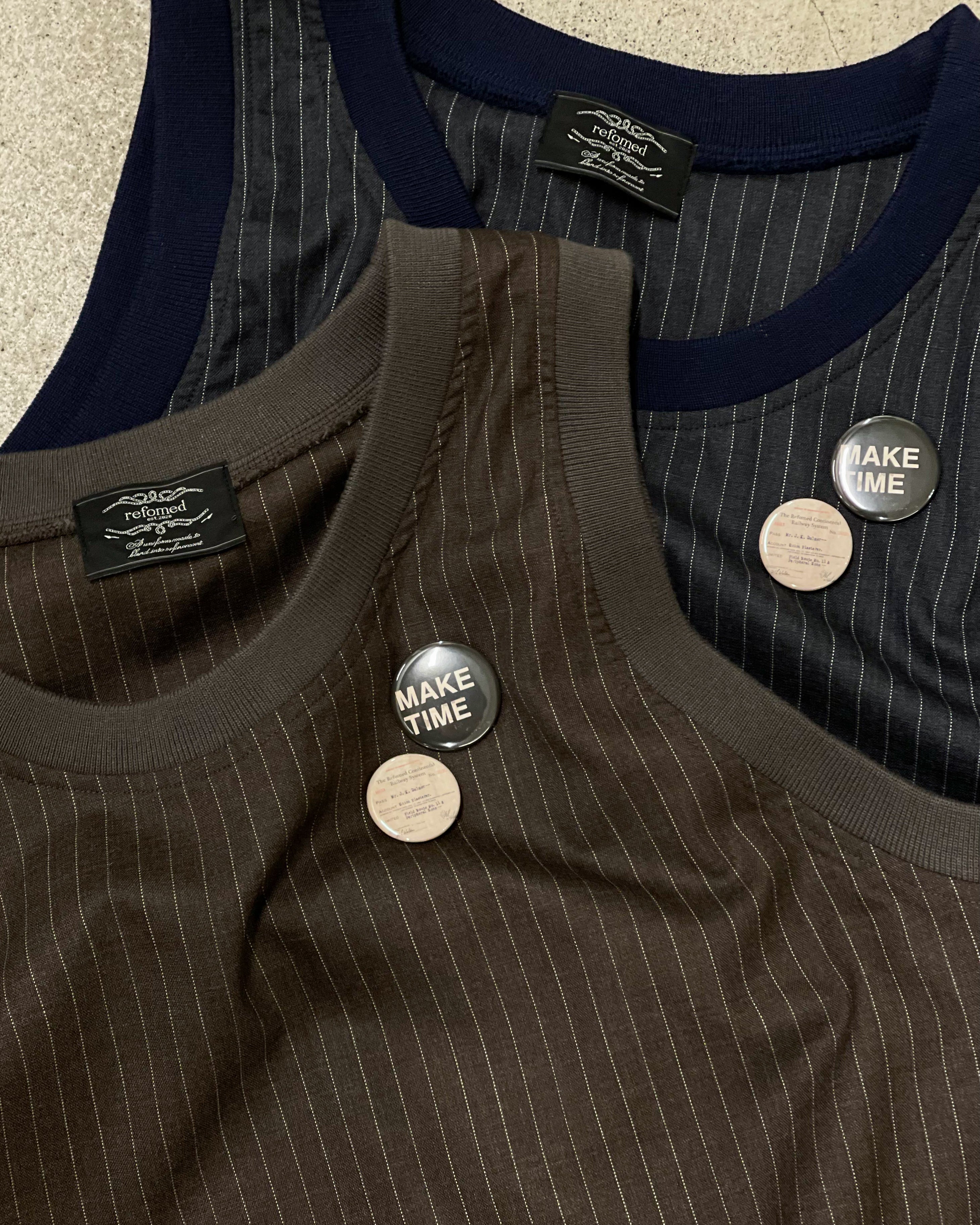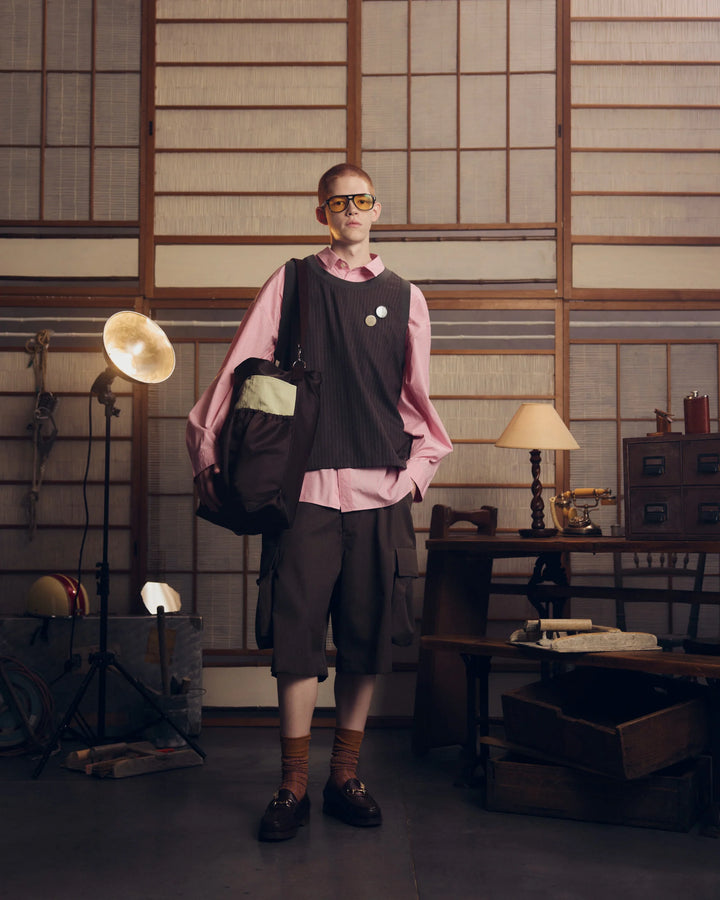 現場仕事で役割ごとに色の違うビブスを渡されていた事をきっかけに制作。生地はウールトロのストライプ素材を使用しており、Tシャツやシャツの上にサラッと重ねやすい一着になっています。