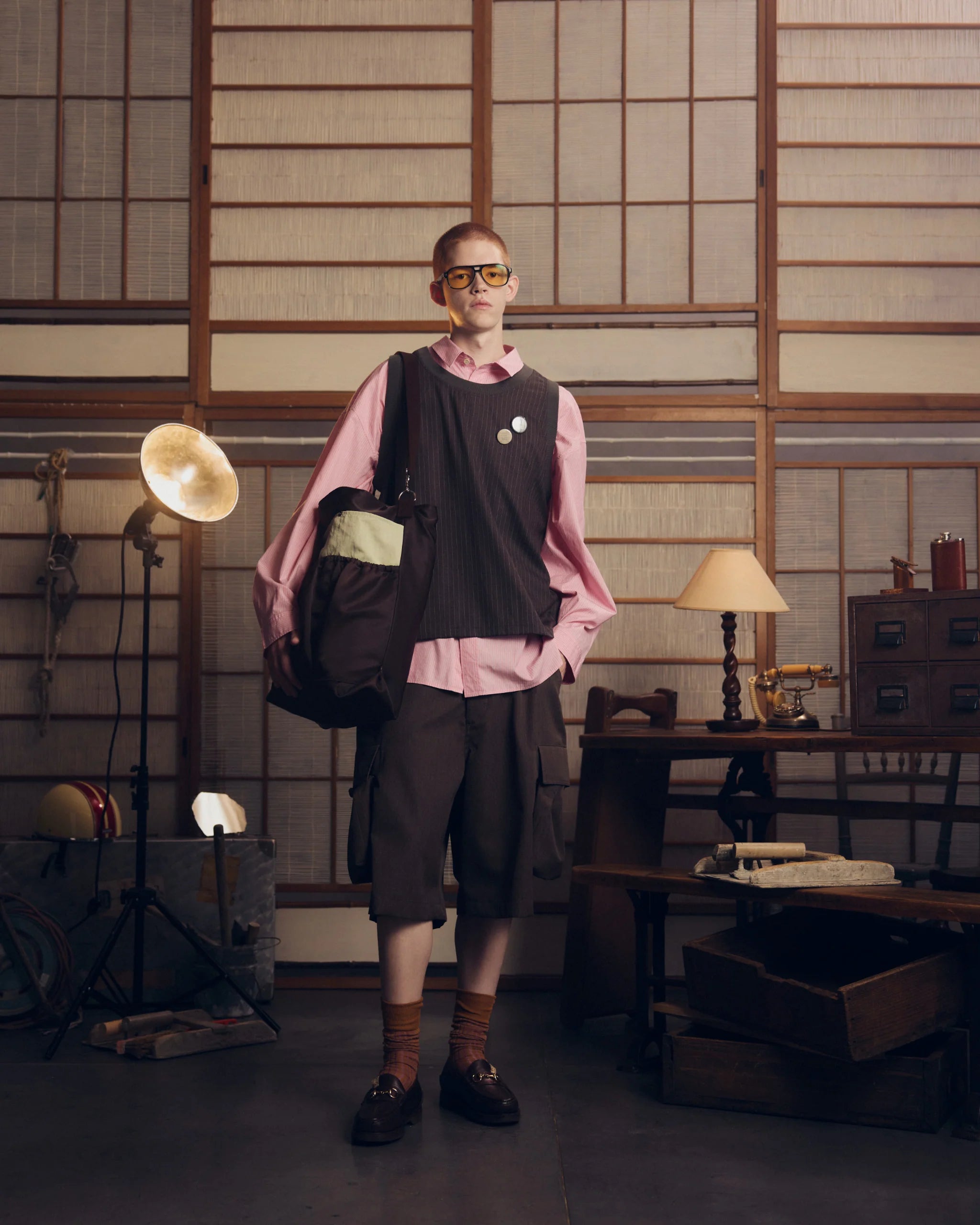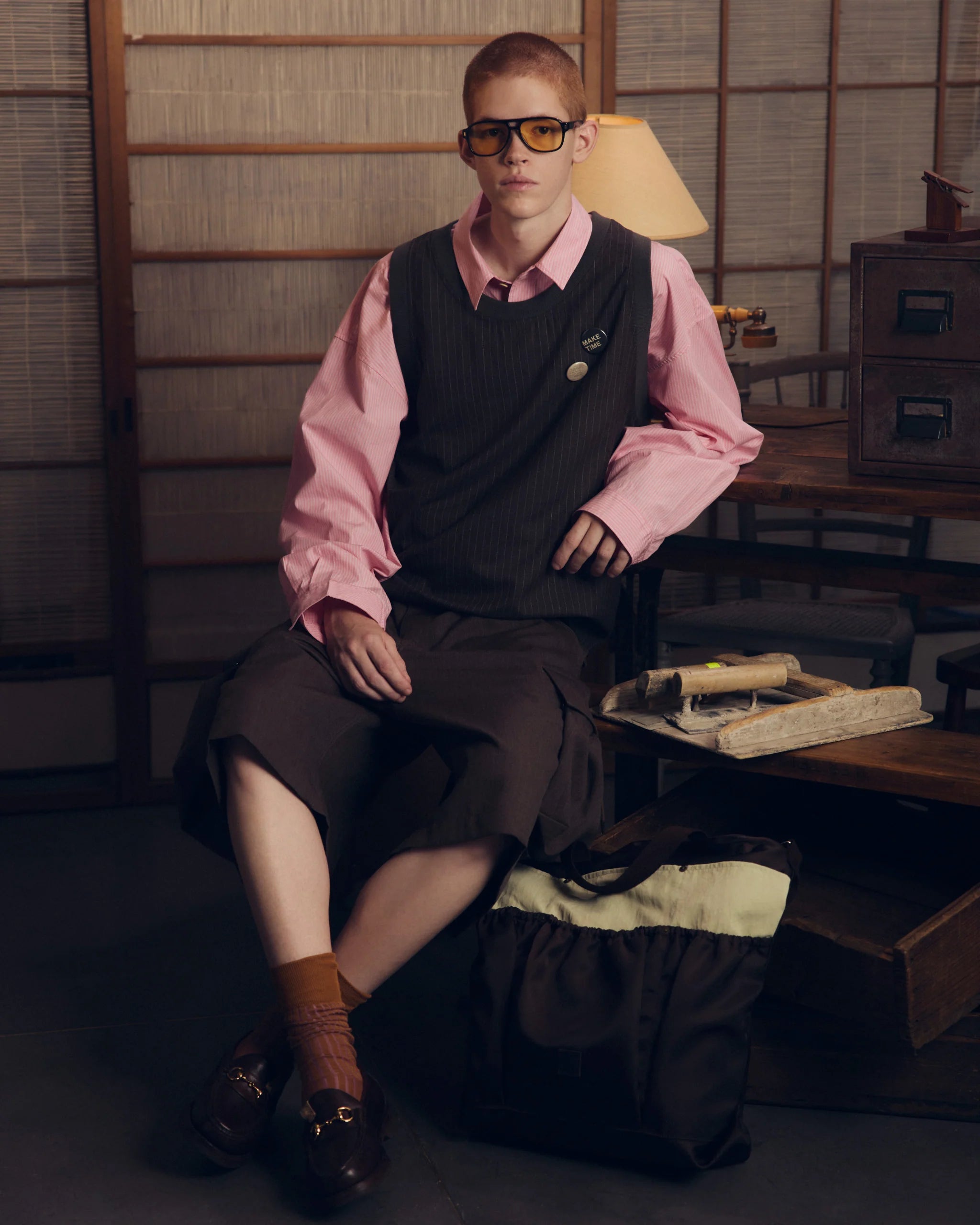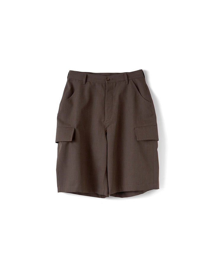 トランクスイメージの前身頃のボタンや、左官に使用するコテ袋をイメージした脇ポケットが特徴的なデザインのウールショーツ。 前回も人気を博したデザインですが、今シーズンはややコンパクトなシルエットに調整。