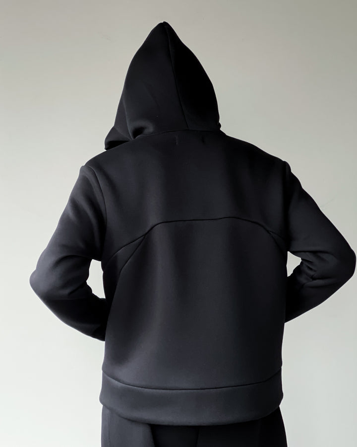 A zip hoodie made from cardboard knit material that is both breathable and warm.