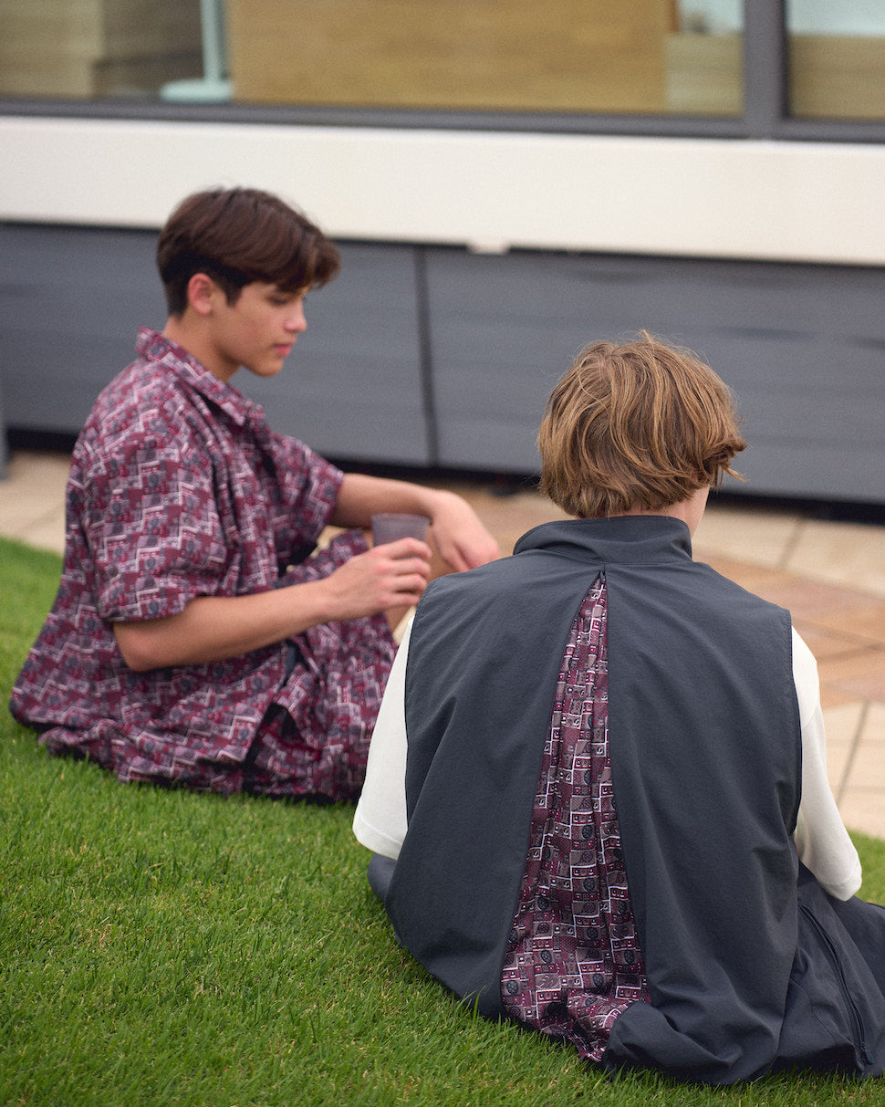 This full-zip windbreaker jacket is made of original fabric with seasonal colors and an all-over print. The inside is fully lined with mesh, which is dry to the touch and perfect for active movement. It has detachable sleeves. It can also be worn as a vest, making it a 2-way design. It also has bold ventilation from the top of the back to the hem. When you open the back zipper, the fully lined mesh is exposed, allowing you to adjust the temperature according to the situation.