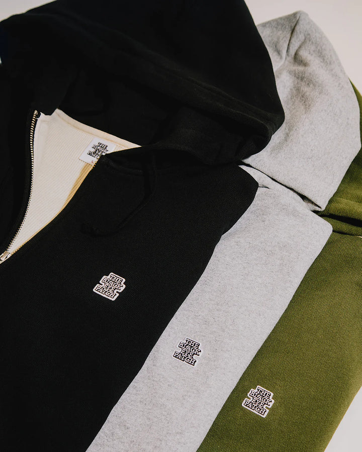 A 12.5oz sweat zip hoodie with "SMALL OG LABEL" logo patch on the left chest. Thermal lining.
