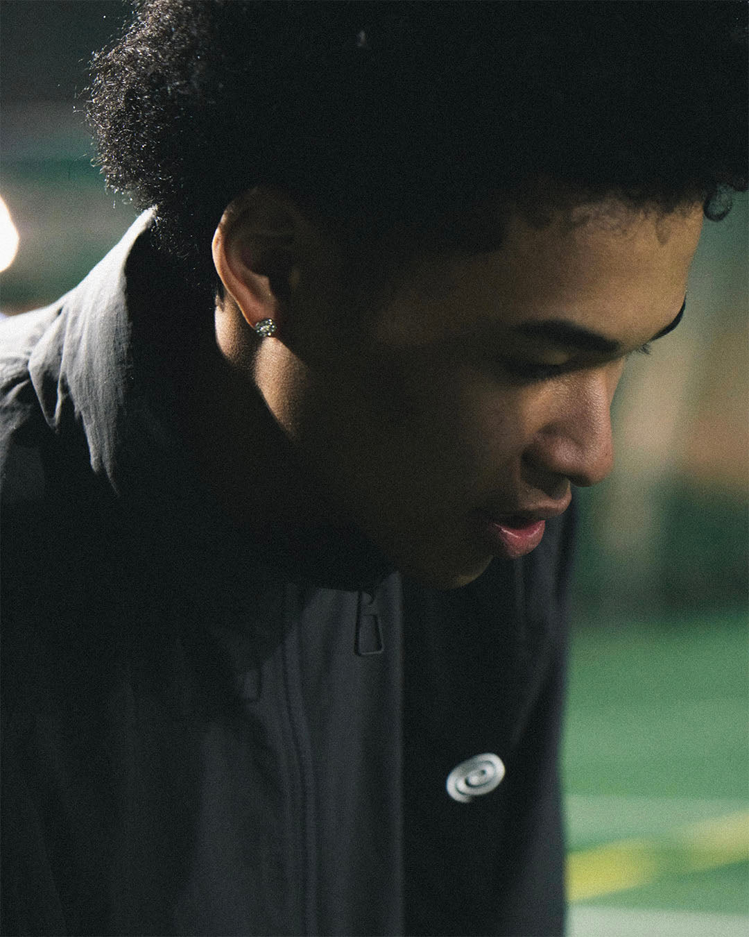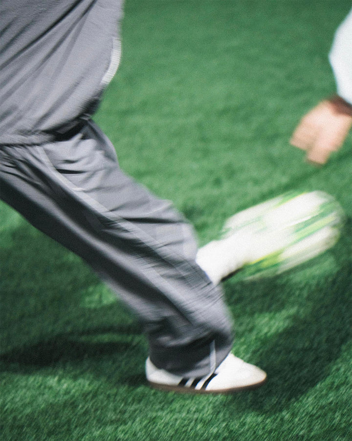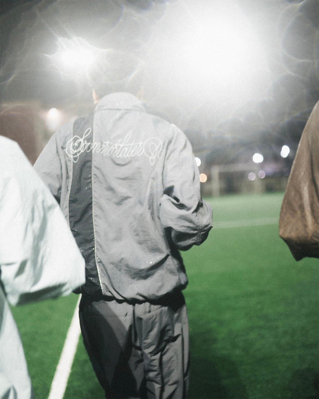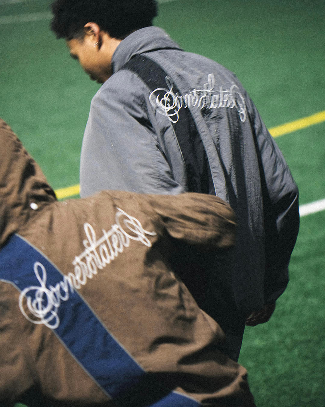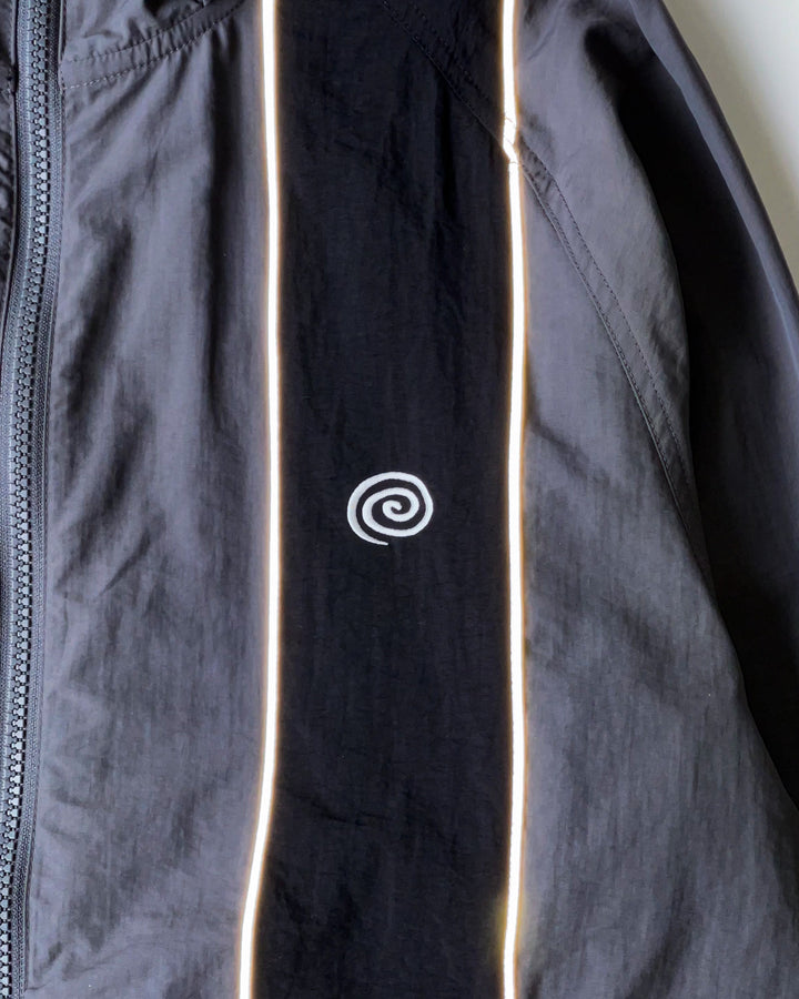 Nylon track jacket with a soccer motif. GuruGuru embroidery on the front. New cursive logo embroidery on the back. Reflective piping. Comes with a hood that can be stored inside the collar.