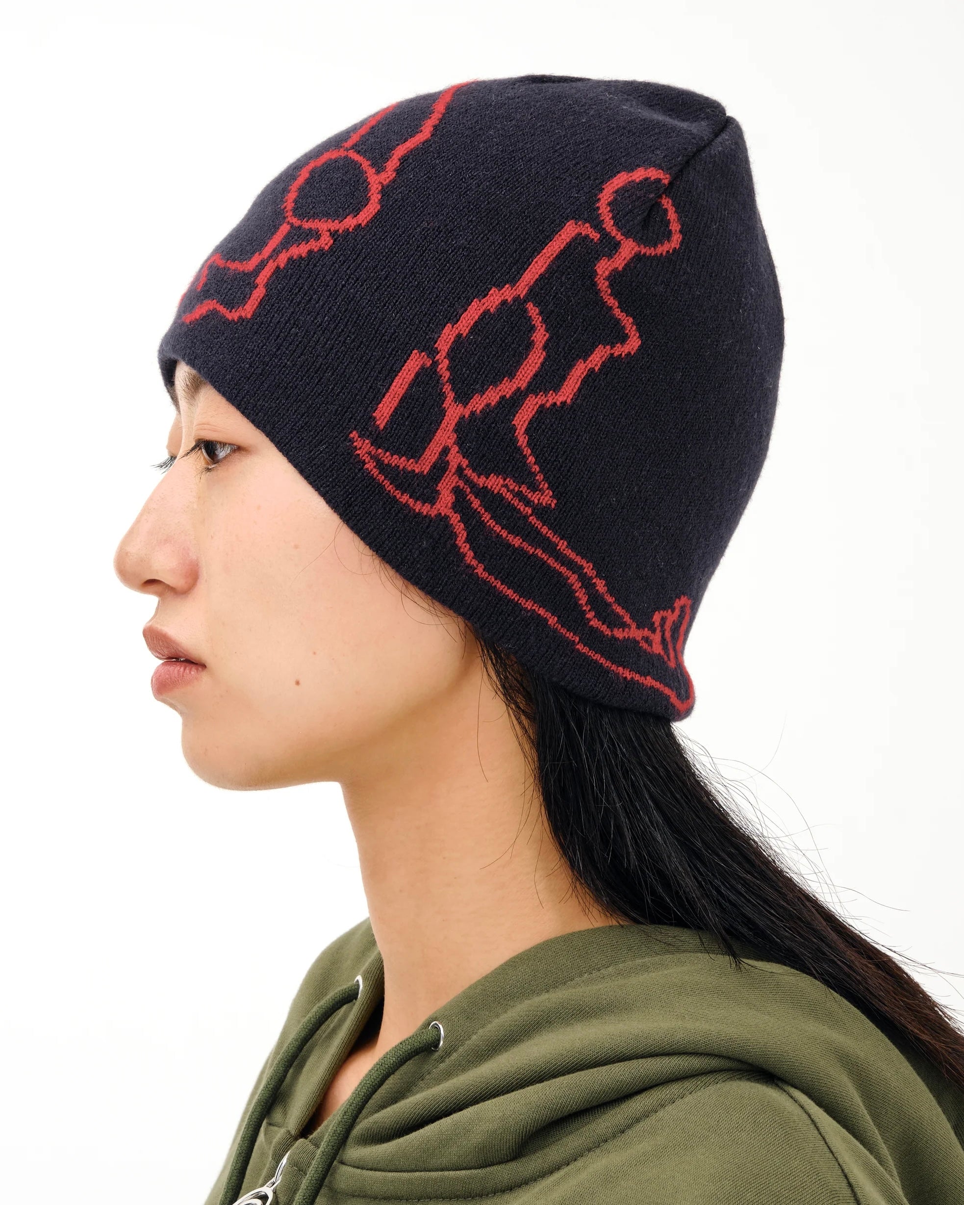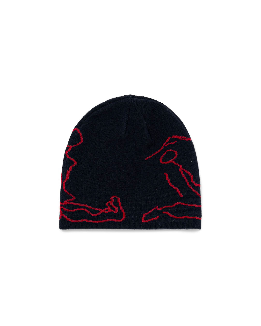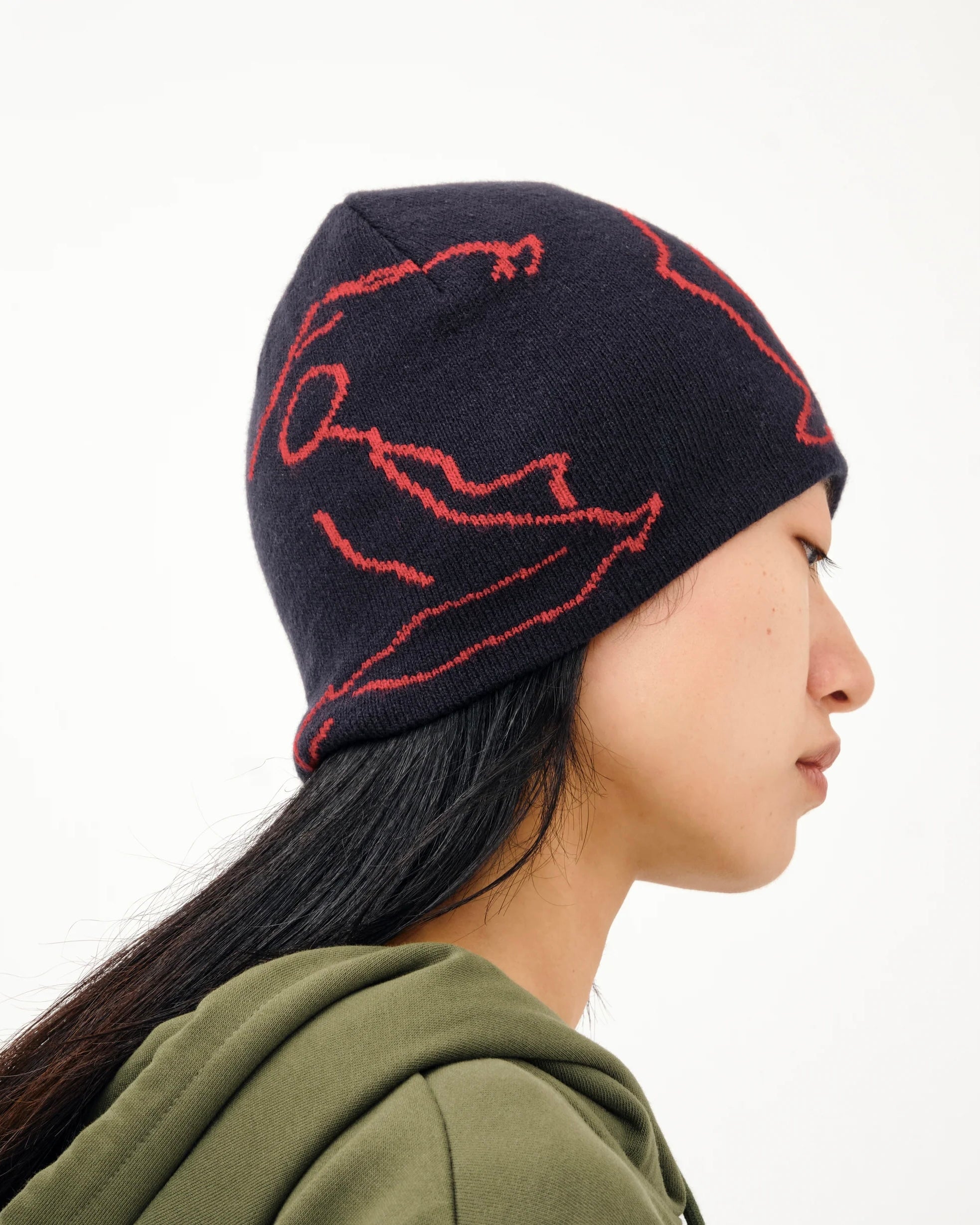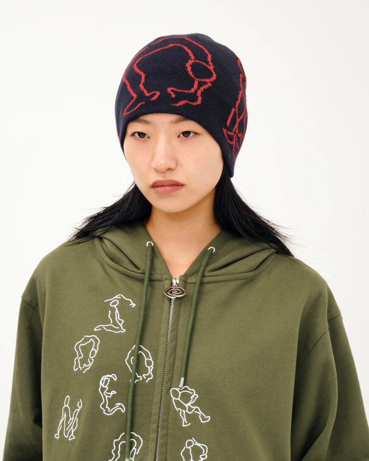 A jacquard knit single beanie featuring the brand logo in the shape of a human with a YOGA motif.
