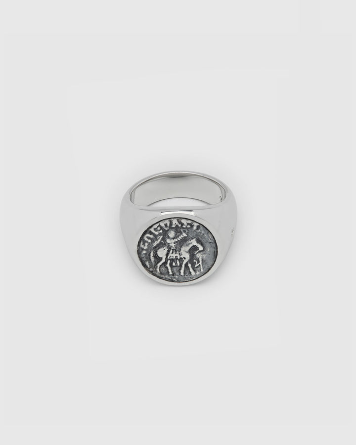 The Coin Ring is a classic signet ring featuring a slightly oxidized coin minted from an authentic Ancient Greek coin used in Afghanistan thousands of years ago, coined by Alexander the Great of the Ancient Greek Kingdom of Macedonia.