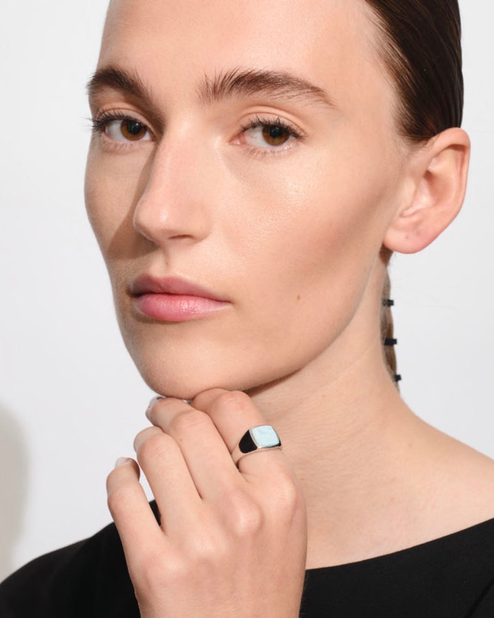 This ring is crafted from polished recycled sterling silver (925) and is white rhodium plated to enhance the surface and prevent tarnishing. All metals are 100% recycled.