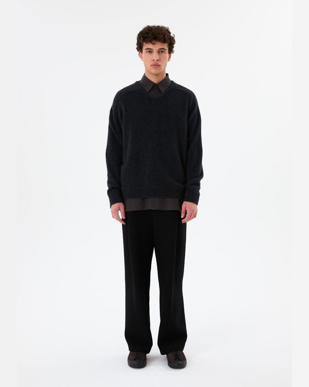 クッション感が感じられるウール素材のパンツです。柔らかなクッション感と感で快適に着用でき、直線的なシルエットと前面のタックディテールで活動性とクラシックさを同時に備えています。ウエスト両側のビジョデイテールでサイズ調整が可能で、ハイウエストとローウエストの二つの演出が可能です。ミニマルなサイドポケットと背面のリップポケットを加え、前ウエストのバンド部分には隠しフックと内ボタンを適用して耐久性を高めました。裾はブラインドステッチで仕上げ、きれいに完成しました。