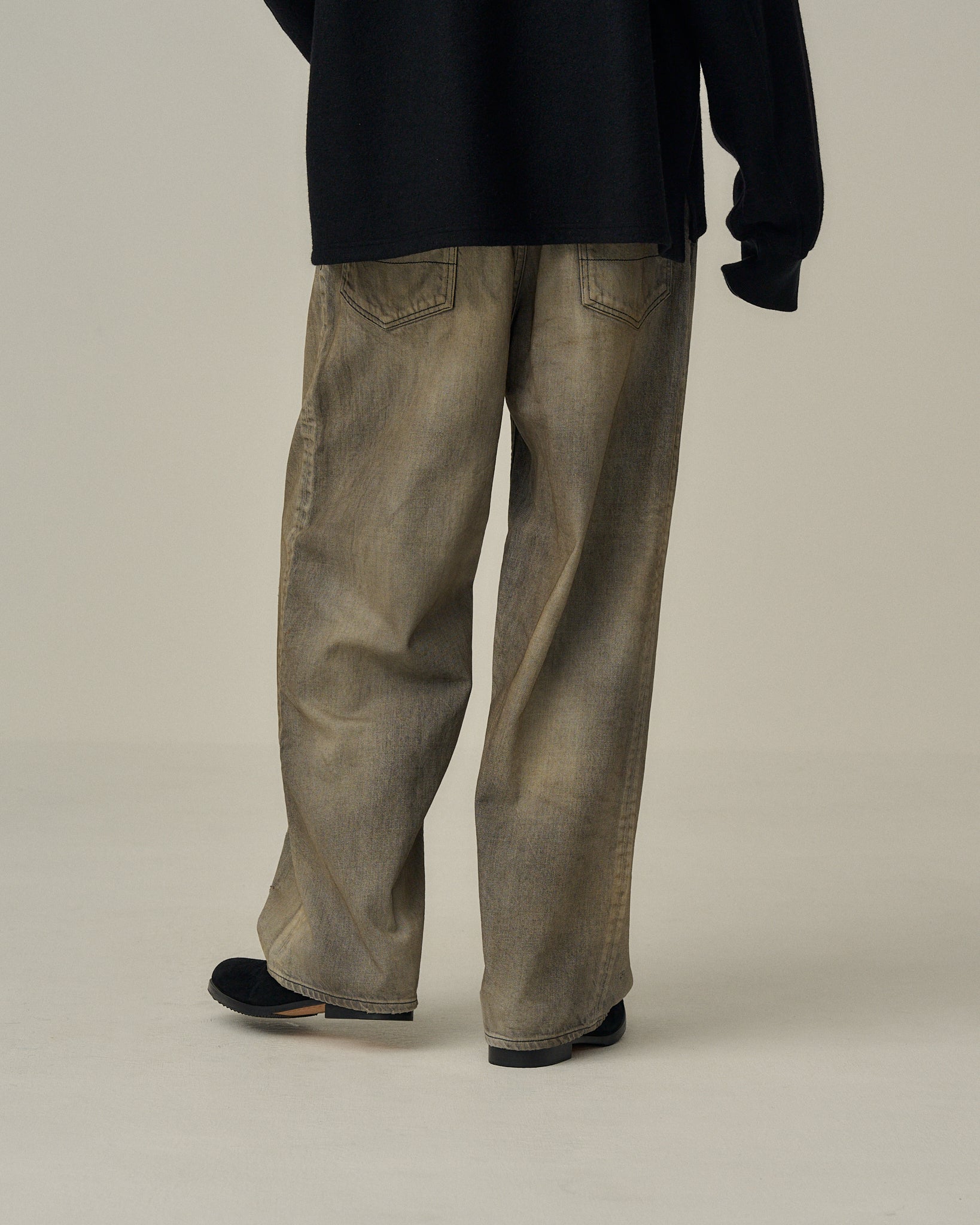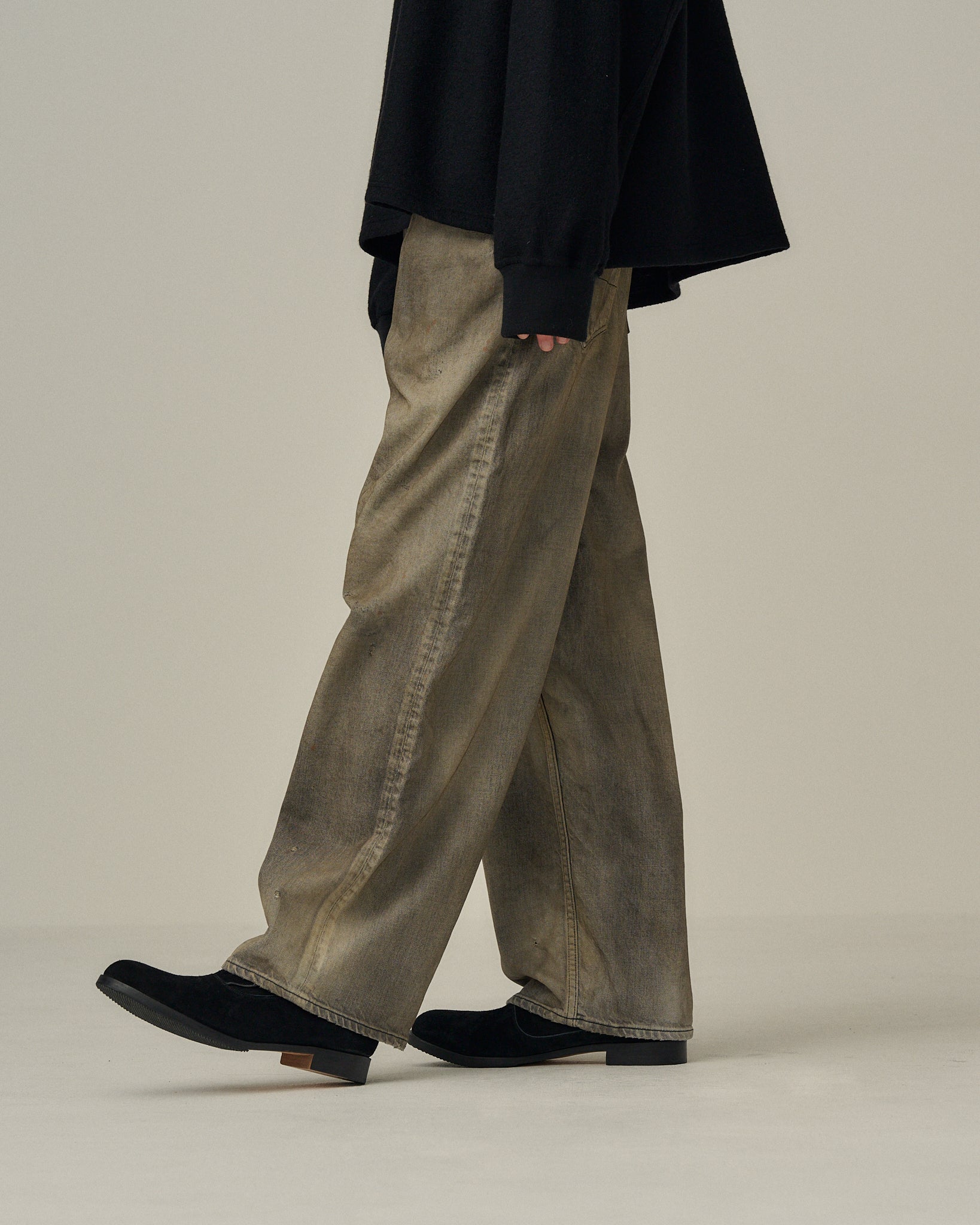 こちらはエイジング加工が施されたバージョンで、熟練の職人が一本一本に手作業で施し小さなダメージの一つ一つまでバランスを調整。今回はウォッシュをしっかり施し、色が抜けた物にペンキや油などの汚れ加工、擦れ感によるグラデーションが美しい一本です。