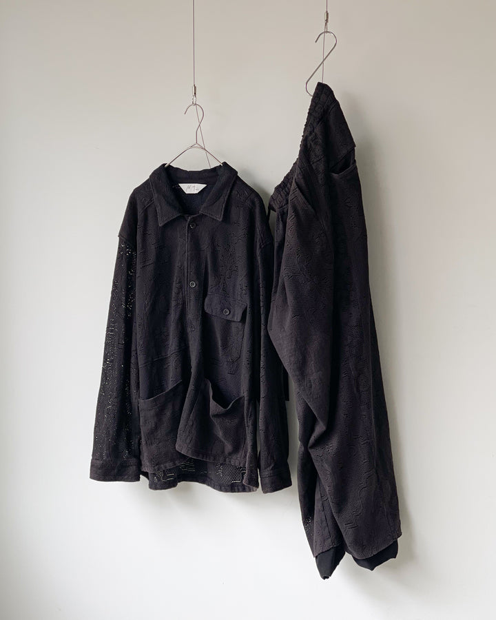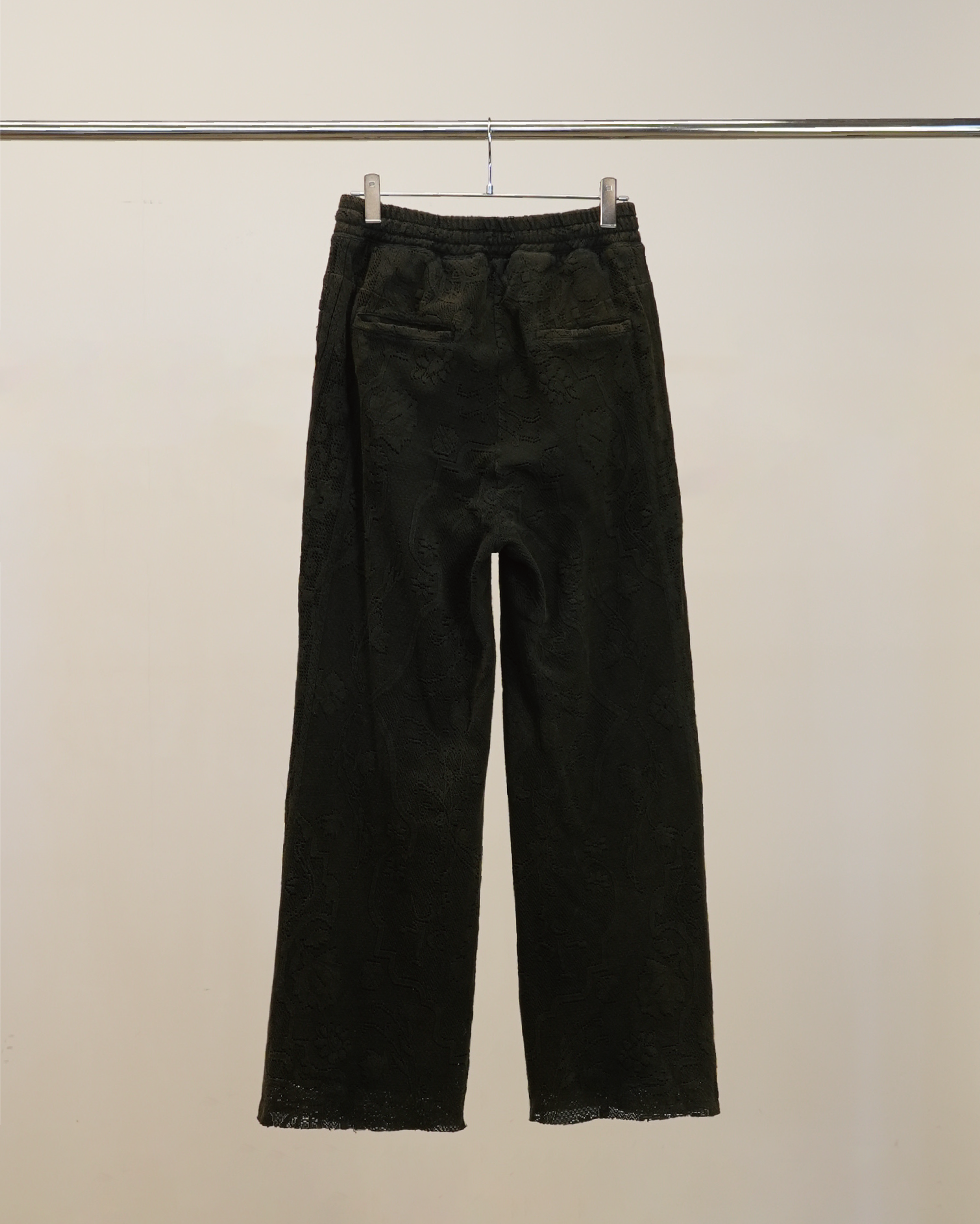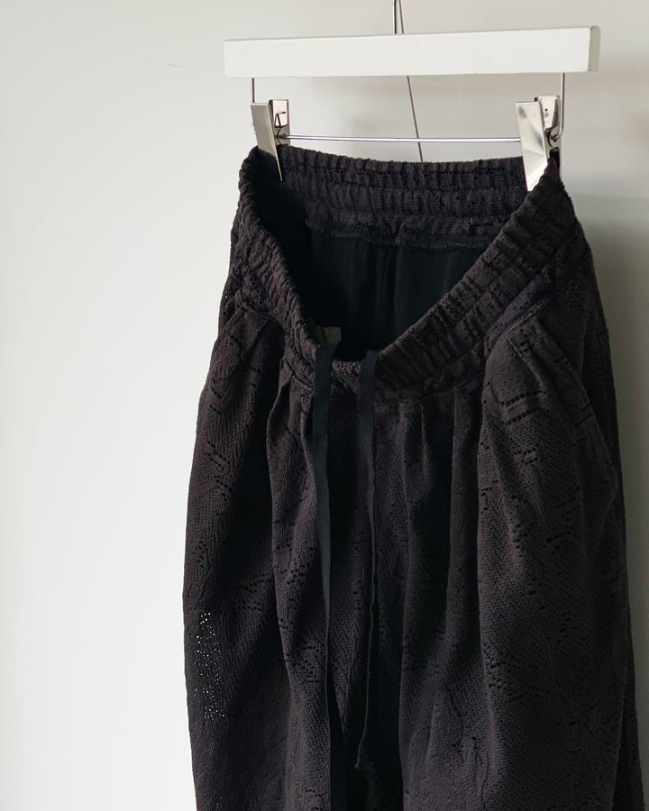 古い時代の手織りのテキスタイルを参考に製作した、オリジナルレースのスラックス。