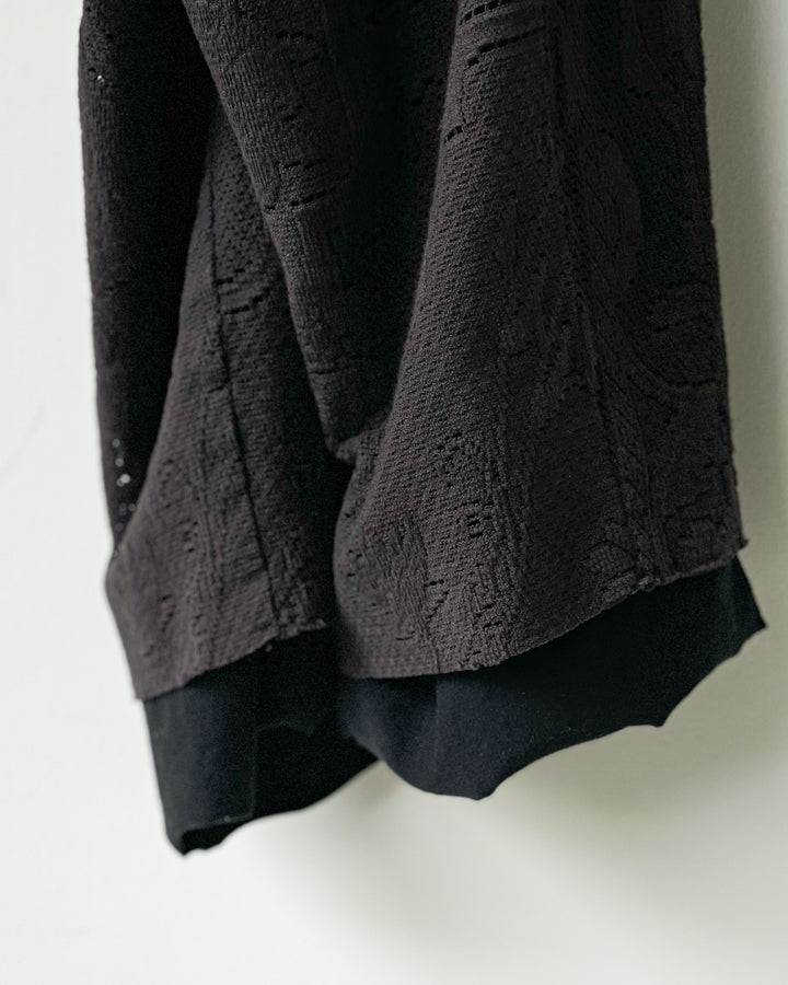 スラックスは暑い季節での着用を想像し、肌に当たらないよう多くのタックを取り入れて、立体となるシルエットを構築。レースをパネル使いにすることで柄のコントラストを強調し、歩いたときに豊かな動きが現れます。また、レースの透け感が強くならないようレイヤードデザインにしており、薄着のシーズンでもしっかりと存在感のあるデザインになってます。履き心地もイージーで、使い勝手よく着用して頂けるスラックスです。