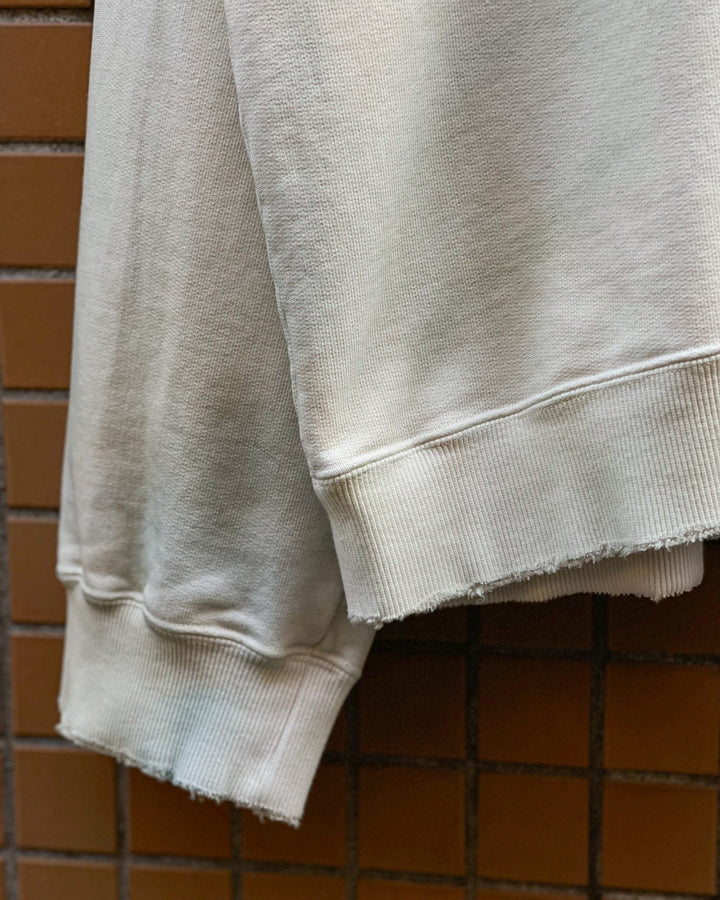 弾力があり肌あたりが良い生地を使用しており、程よくダメージを施した裾や首元など、使い込むことで自分色に育てていける一着になってます。この時期はメインで、寒くなるとインナーでも活躍間違いなしです。是非お試しください。