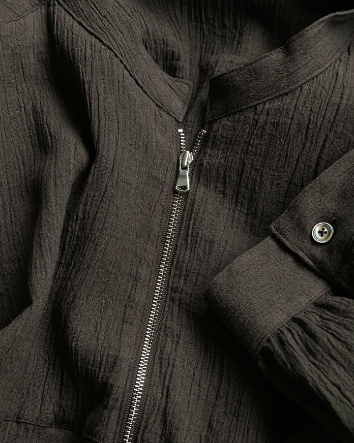 コットンリネンのクレープ生地で製作した新型のジップシャツ。