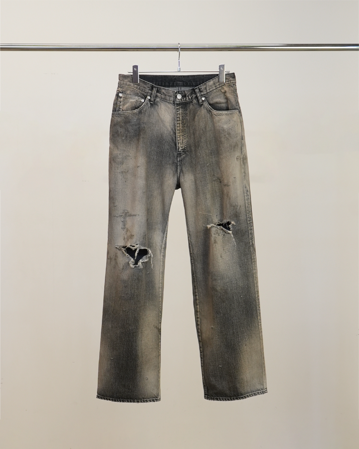 今季初登場のミドルストレートをベースに迫力のあるクラッシュダメージを加え、より強くグランジの空気を纏わせています。今季はジャケットやシャツ、ニットなど品の良いアイテムが気分になっている事もあり、とても良いバランスで使っていただける一本かと思います。