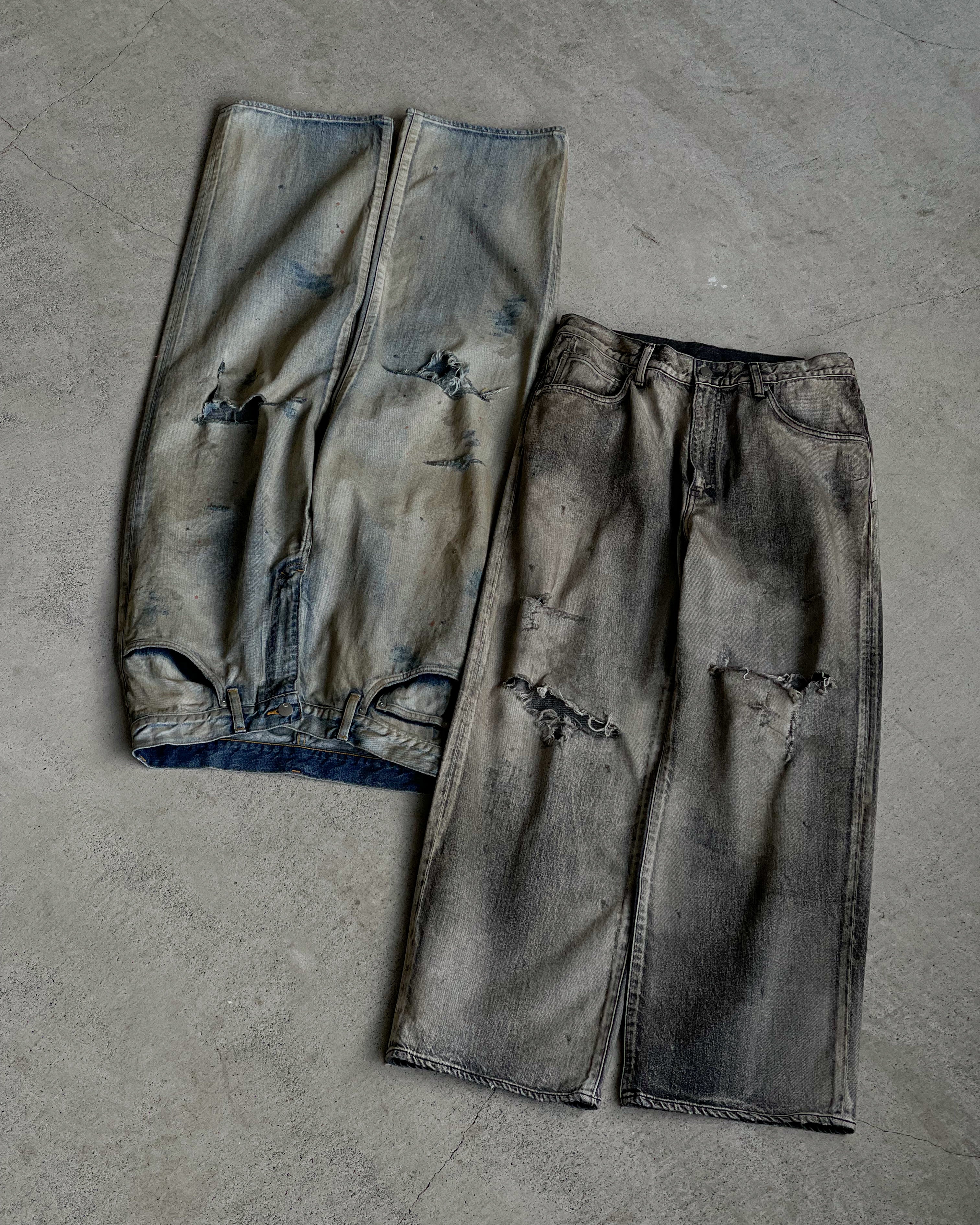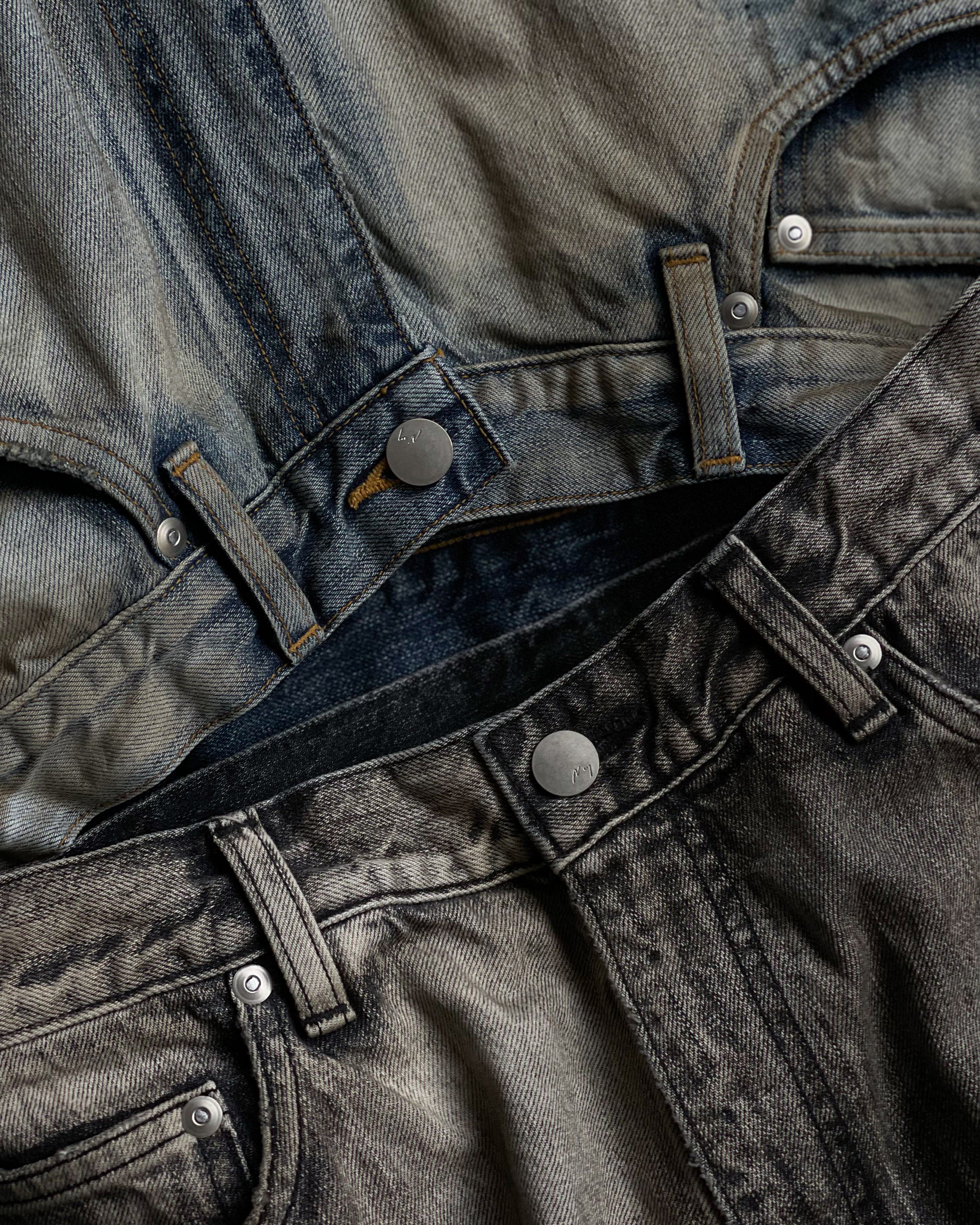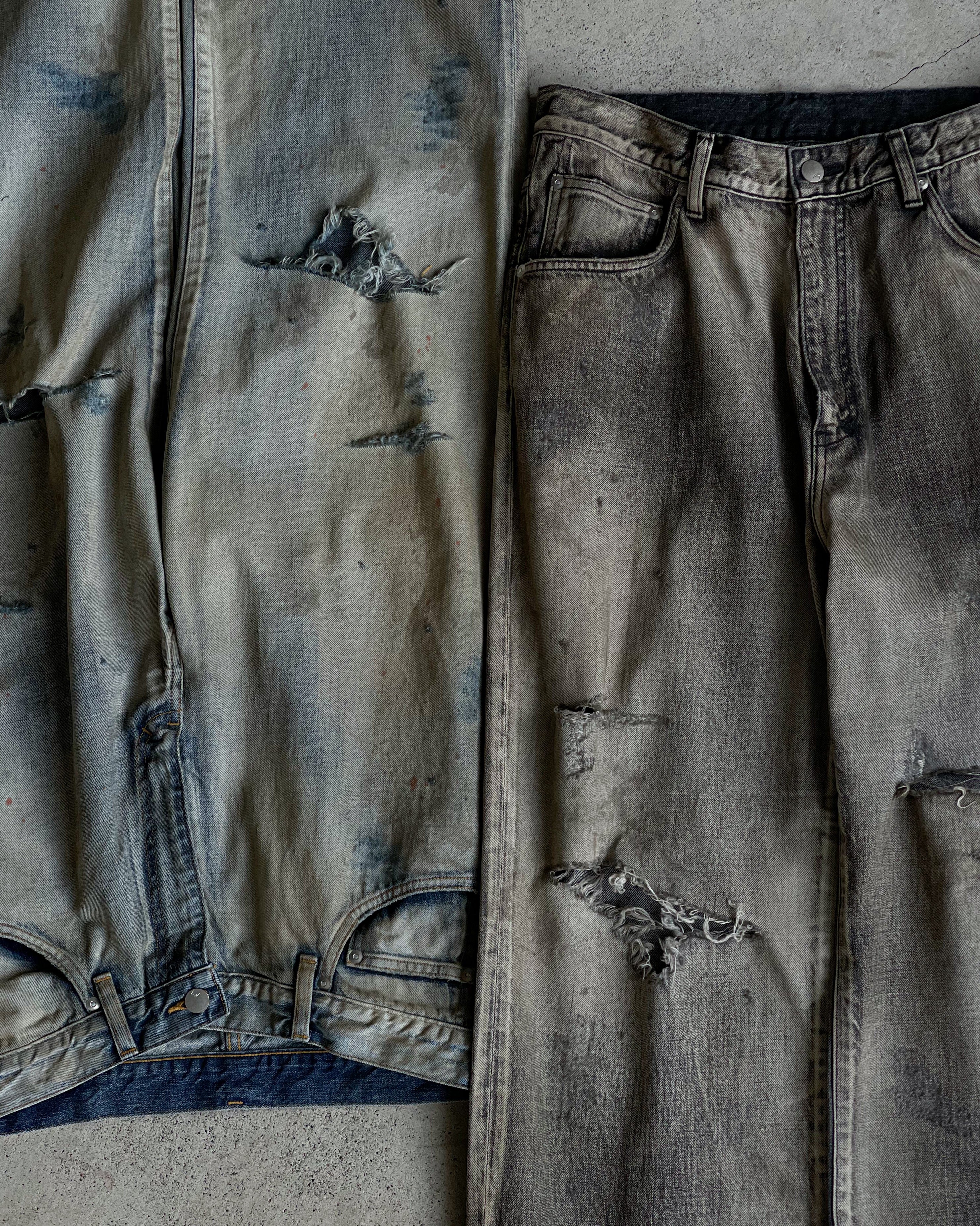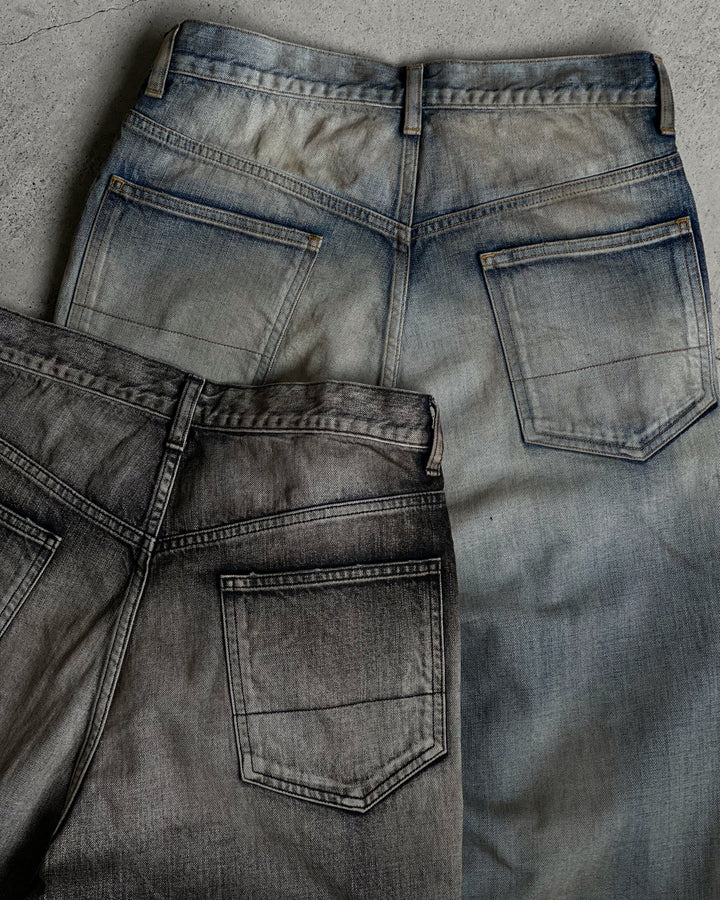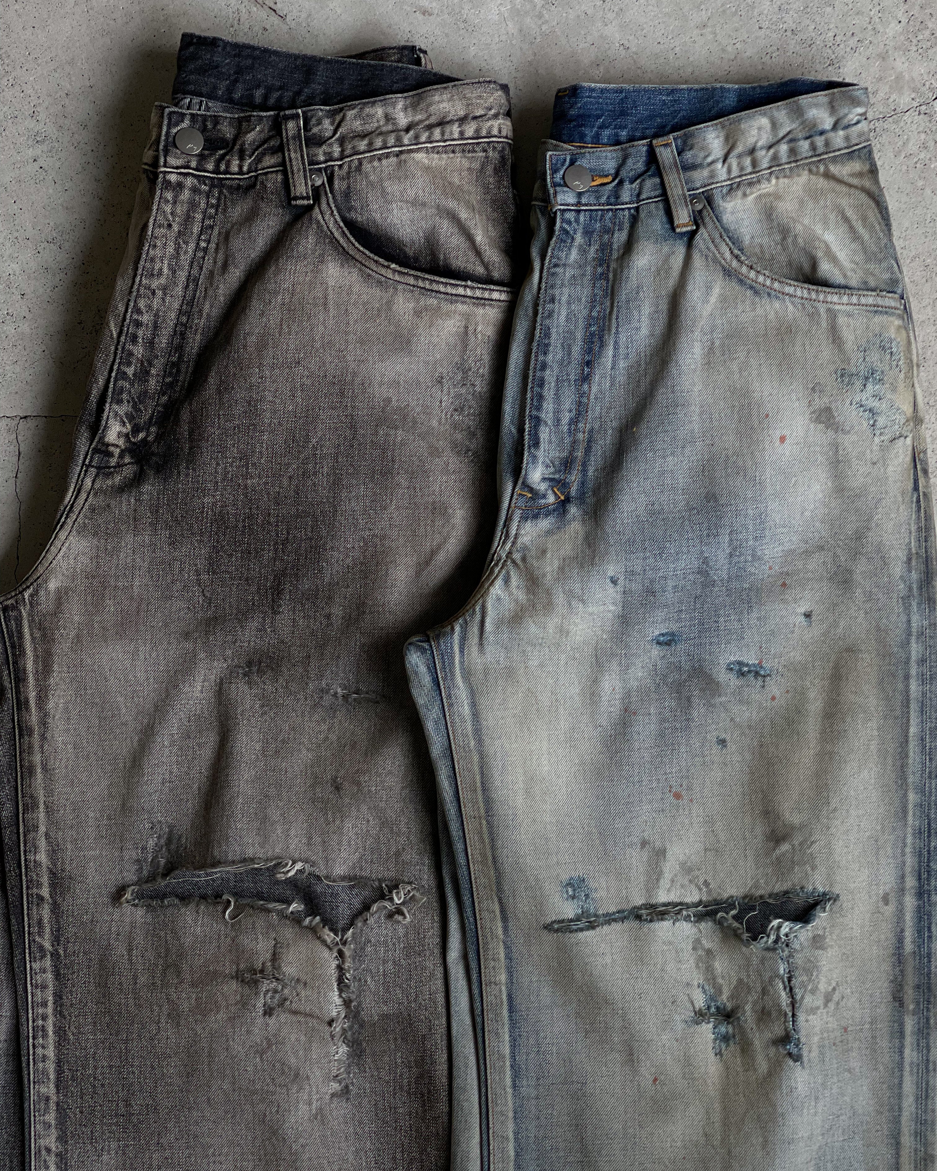 加工は熟練の職人が手作業で行っており、淡いグラデーションフェードにコントラストを効かせた汚し、迫力のあるダメージを計算したバランスで配置。激しい加工を美しい色調で調和させることで、様々な方が着用しやすい絶妙な塩梅に仕上がっています。