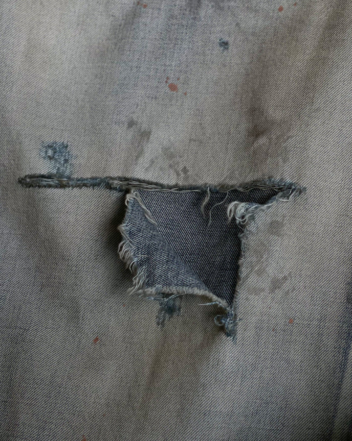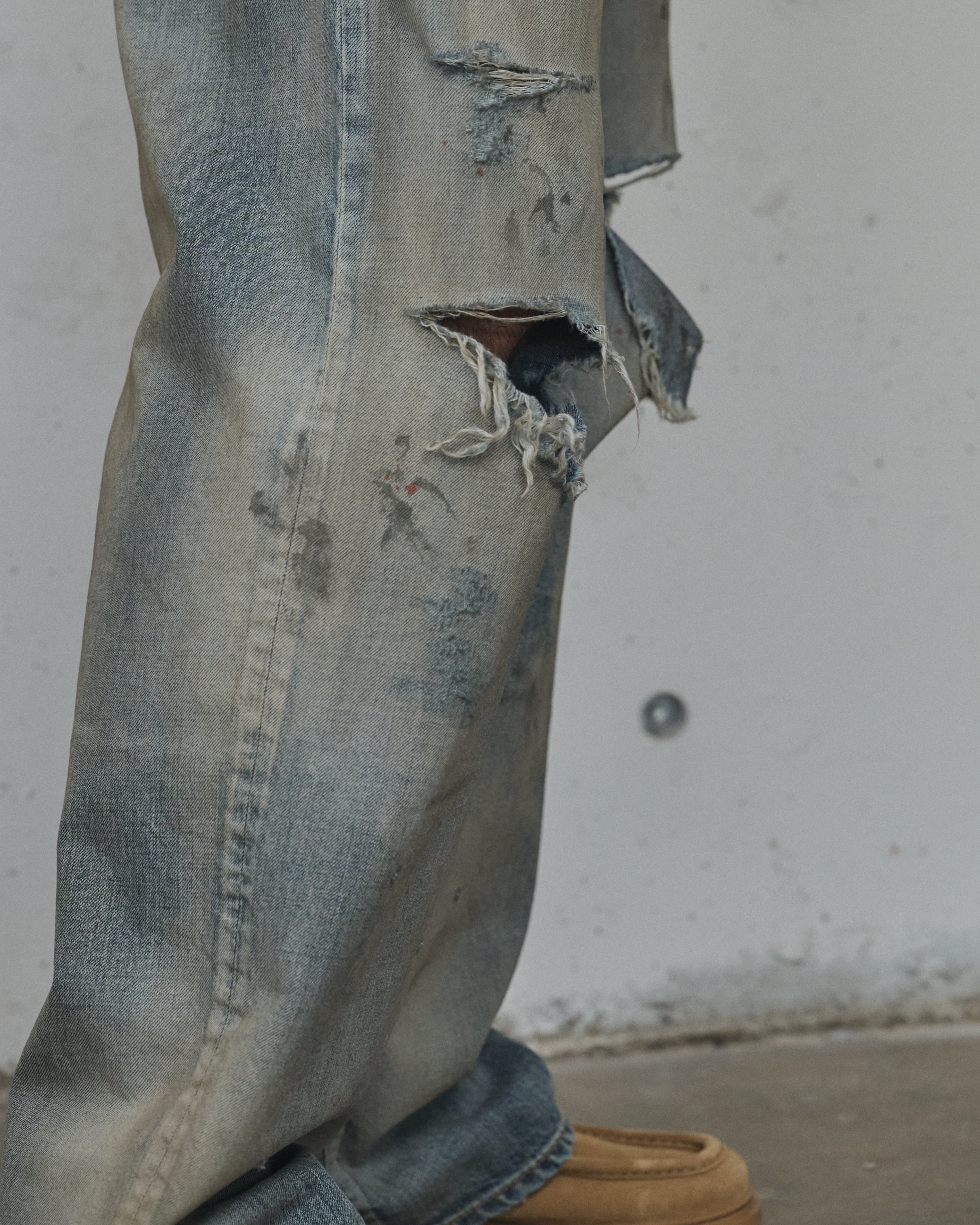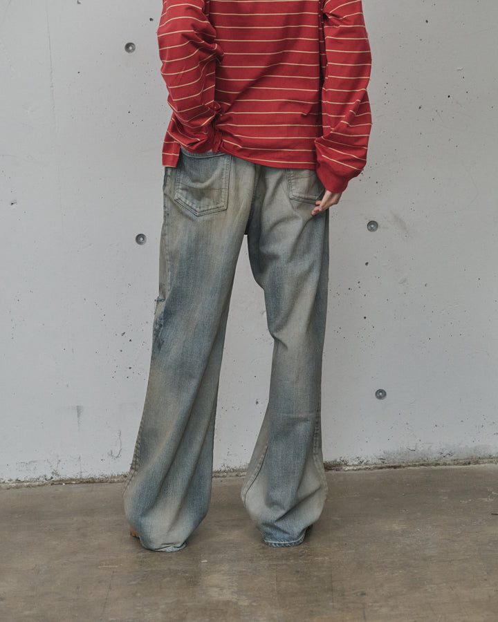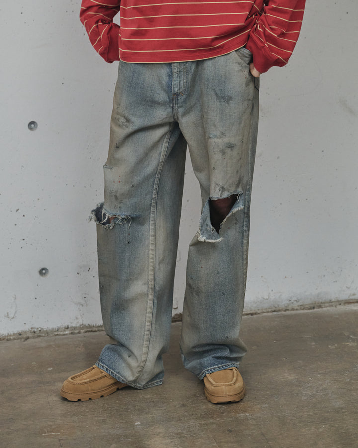 加工は熟練の職人が手作業で行っており、淡いグラデーションフェードにコントラストを効かせた汚し、迫力のあるダメージを計算したバランスで配置。激しい加工を美しい色調で調和させることで、様々な方が着用しやすい絶妙な塩梅に仕上がっています。