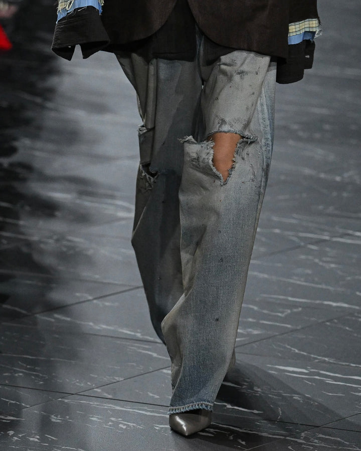 今季初登場のミドルストレートをベースに迫力のあるクラッシュダメージを加え、より強くグランジの空気を纏わせています。今季はジャケットやシャツ、ニットなど品の良いアイテムが気分になっている事もあり、とても良いバランスで使っていただける一本かと思います。