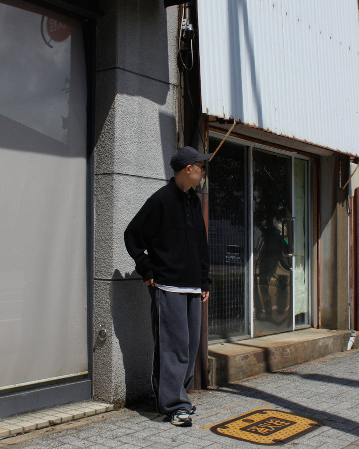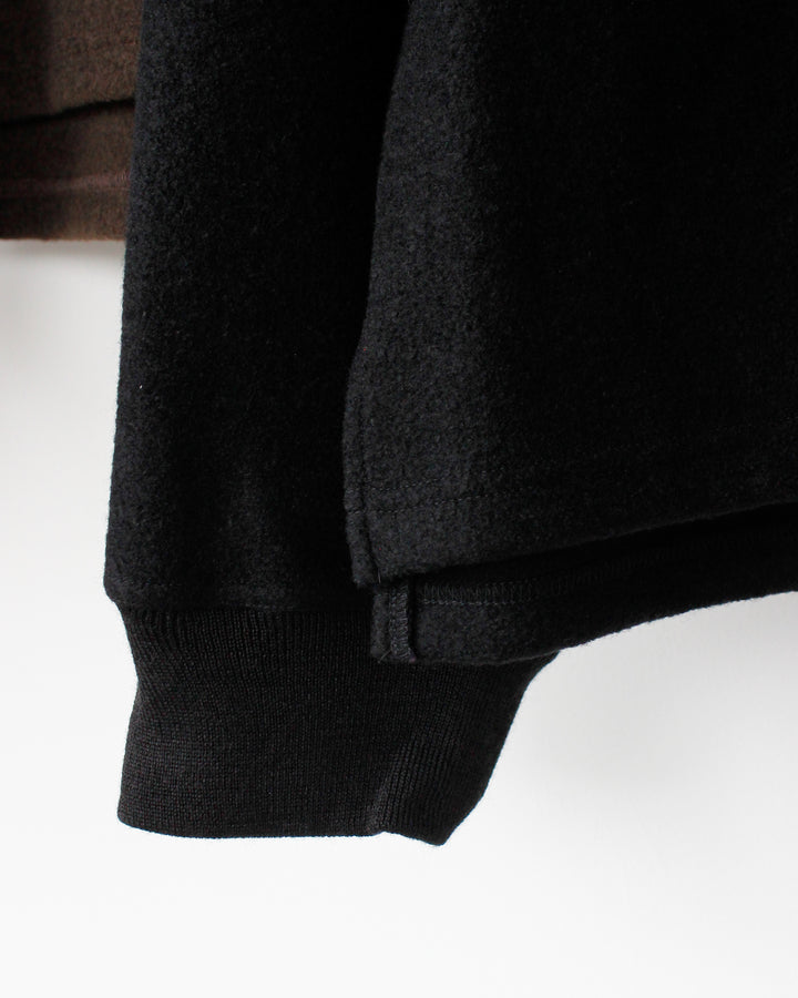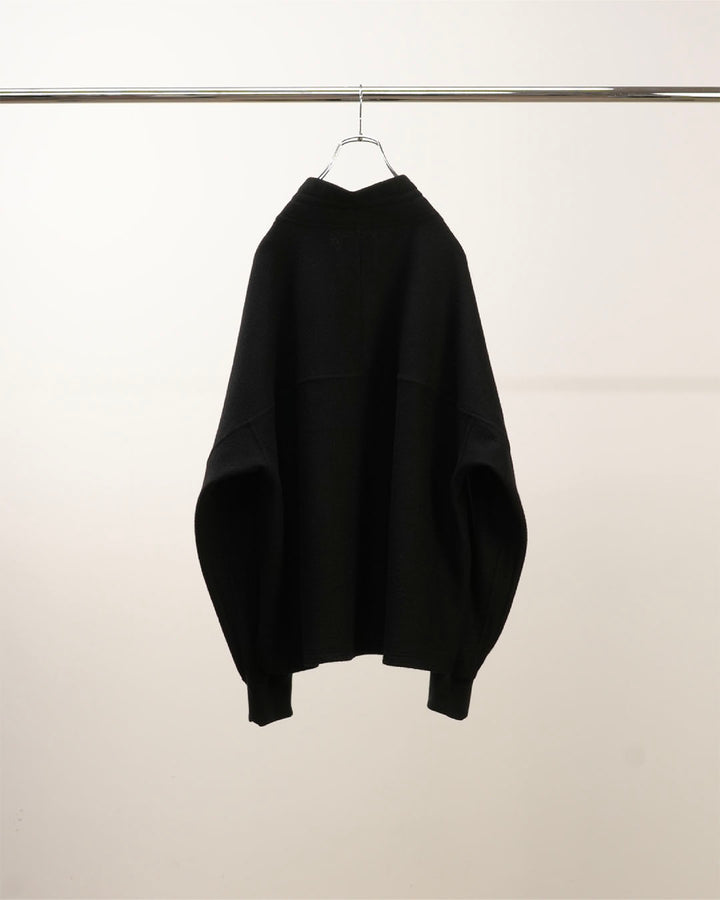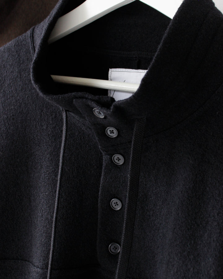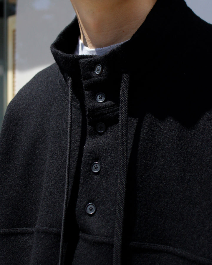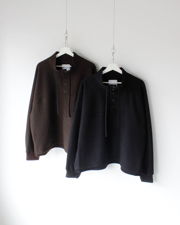 1990年代のアスレチックウェアに頻発した雑に羽織れるナイロンのプルオーバーをサンプルソースにし、ウールのカット素材で製作することでて上品に昇華させたプルオーバーシャツ。