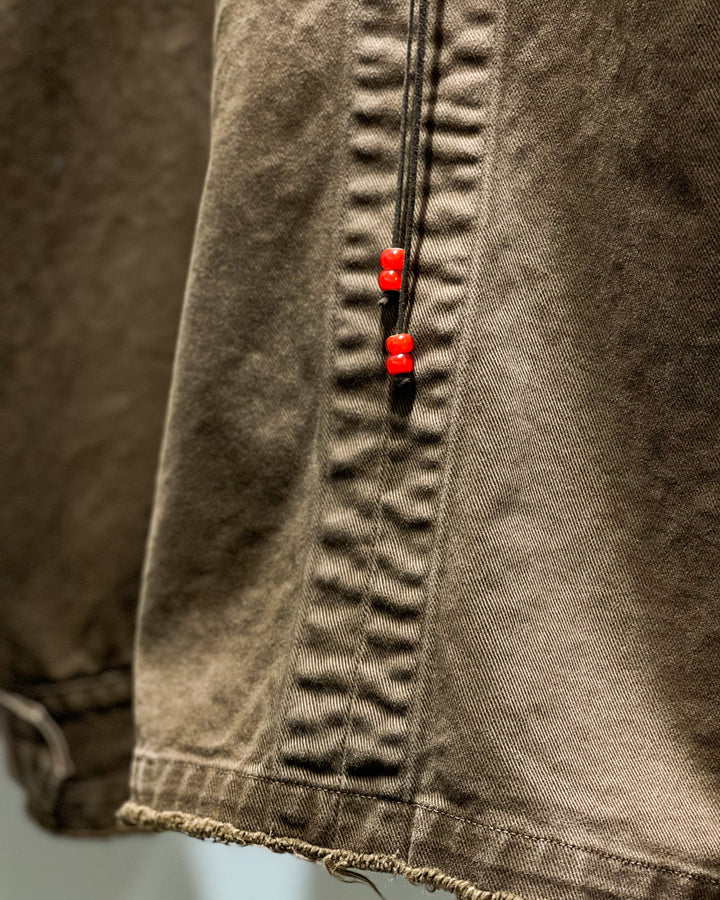 断ち切りの裾から糸が落ち、ステッチにはパッカリングの畝りも見られる。古着のような質感を纏いながらも、古着では見られないムードとシルエットで構築された一着です。