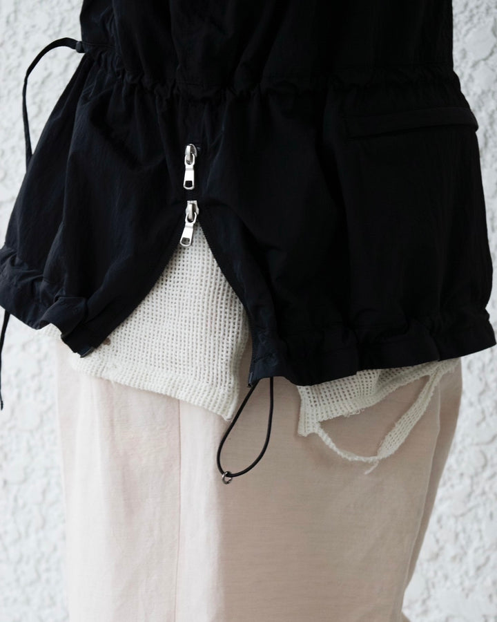 フロントZIPは深めに切り込み、ZIPUPでもスキッパーのようにも楽しめる仕様に。ネックやウエストのコードを調整することでシルエットも可変式となっております。