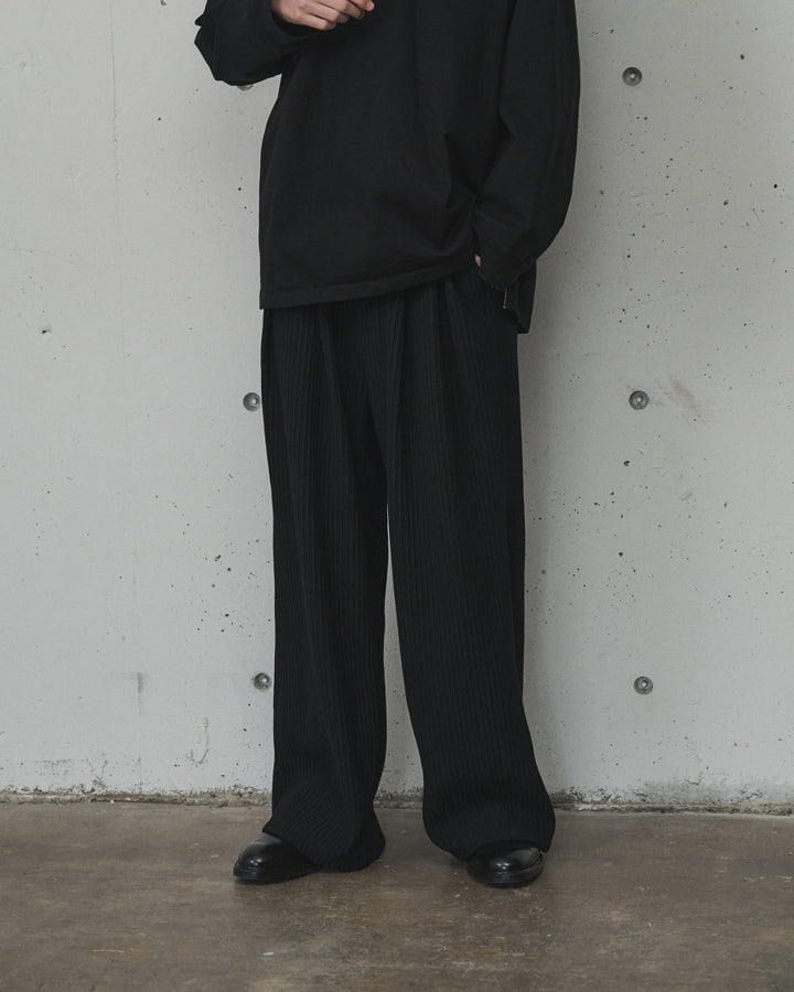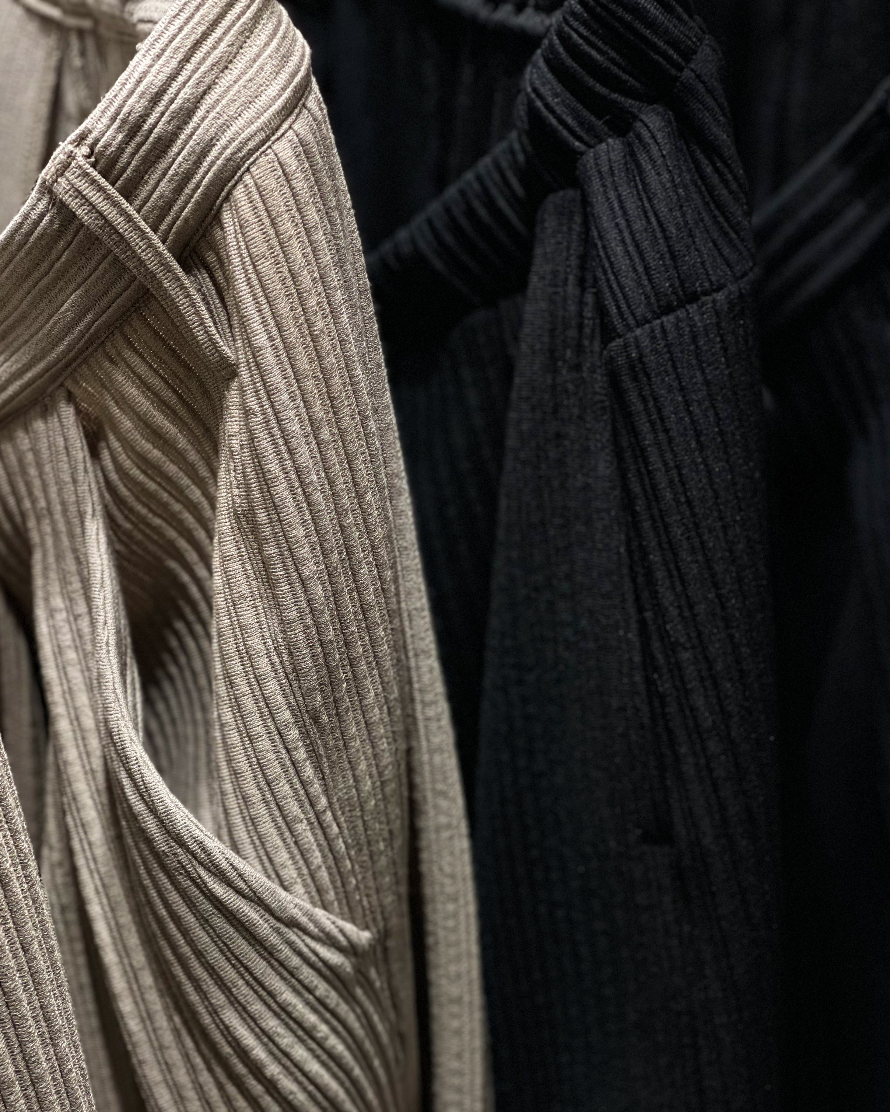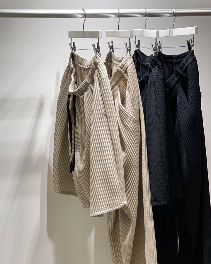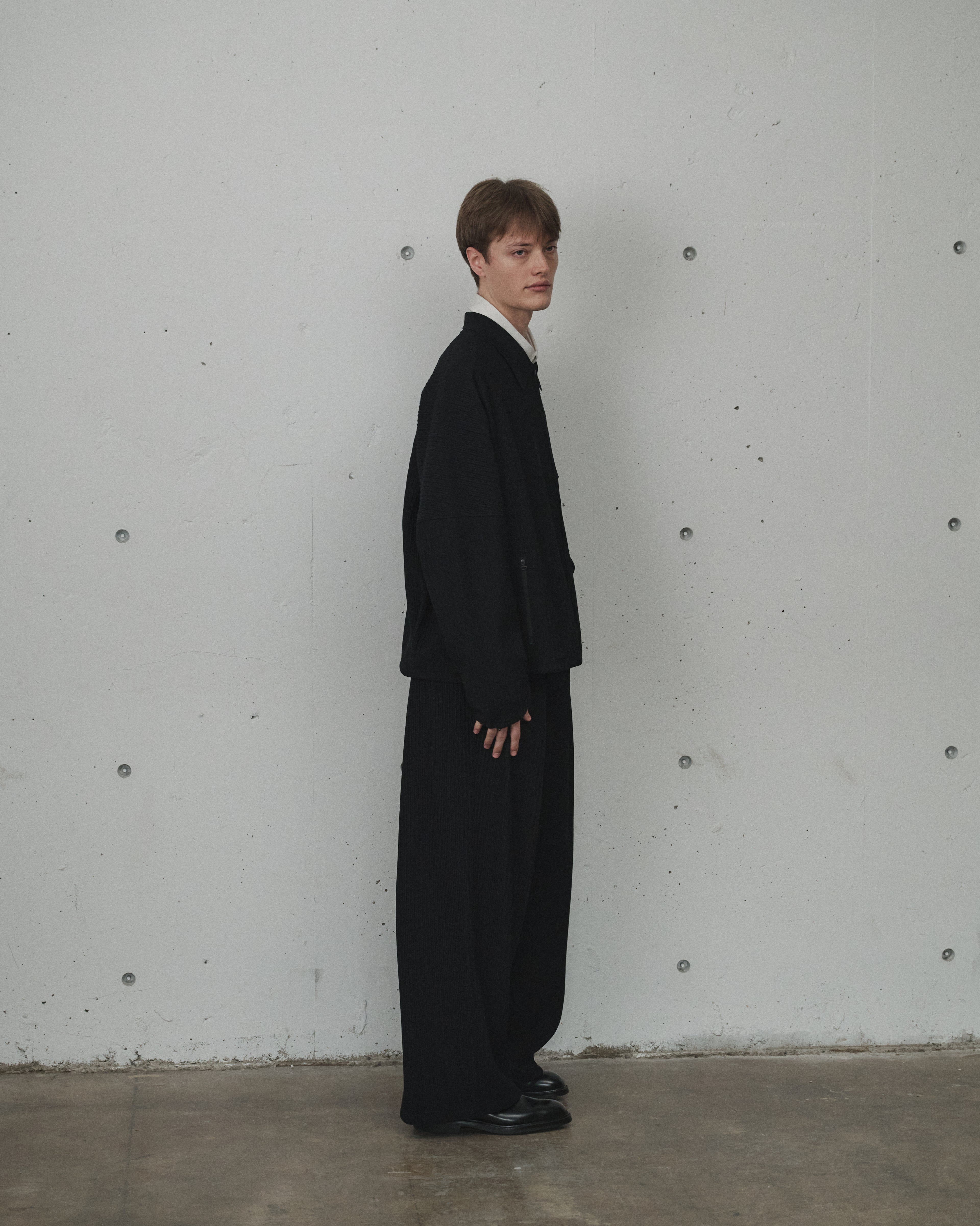 畝をストライプに見立てながら、立体感の強い生地が存在感バッチリなので、デザインはシンプルに設計。スラックスは内にドローコード、外にベルトループ付き。どちらもフロントの深めのタックと豊かなドレープによる陰影が美しい一本です。