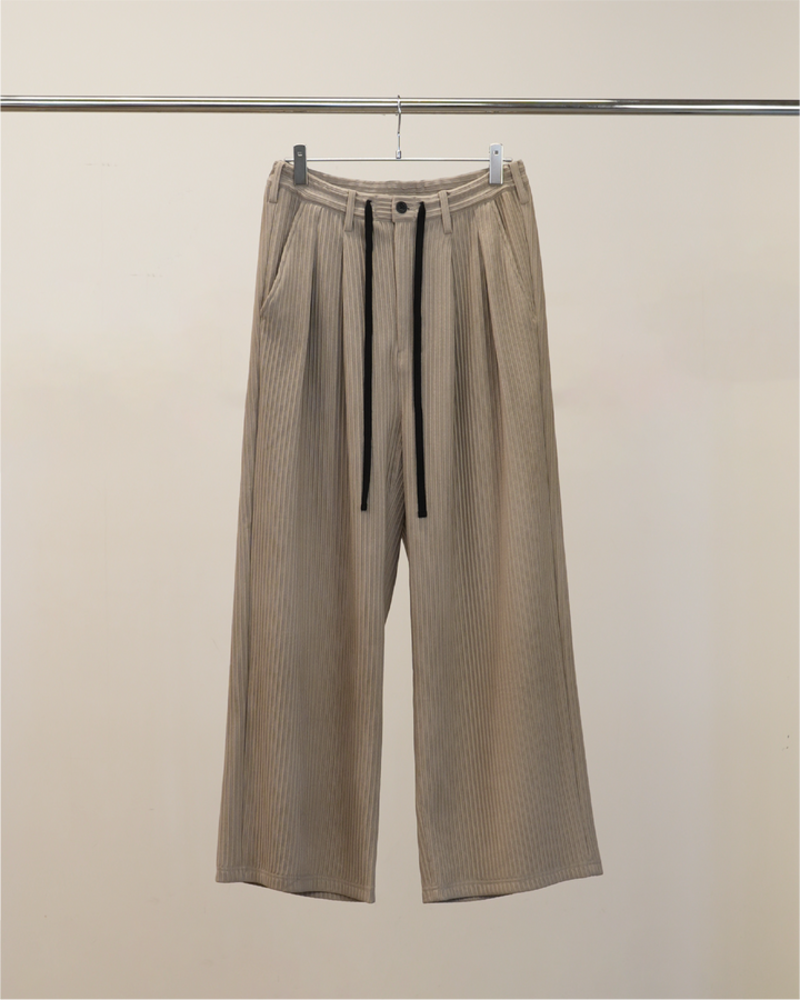 畝をストライプに見立てながら、立体感の強い生地が存在感バッチリなので、デザインはシンプルに設計。スラックスは内にドローコード、外にベルトループ付き。どちらもフロントの深めのタックと豊かなドレープによる陰影が美しい一本です。