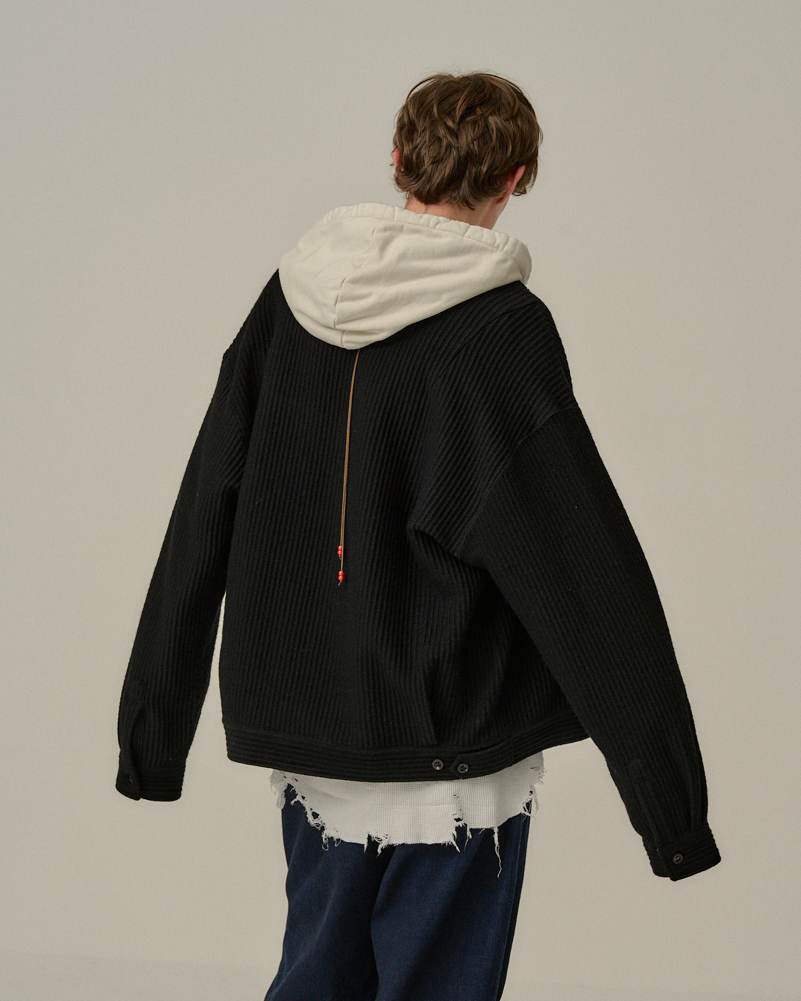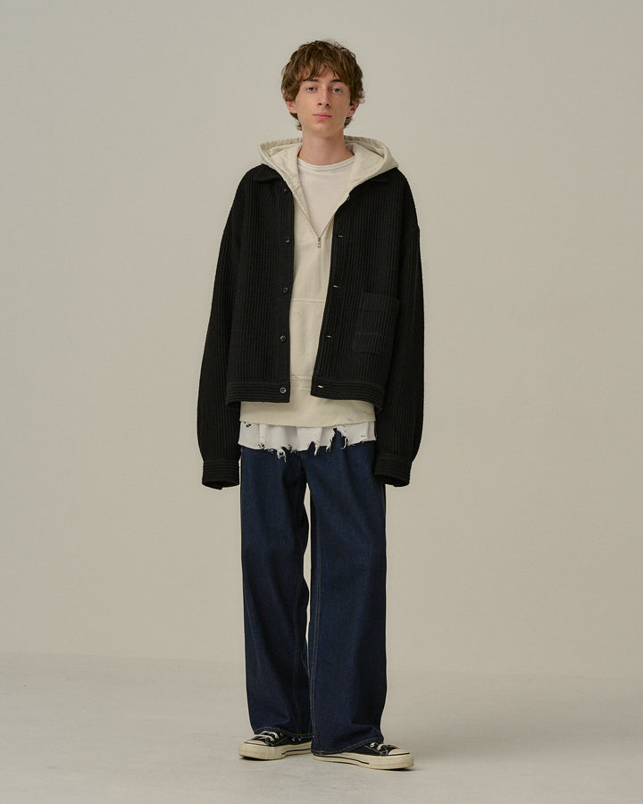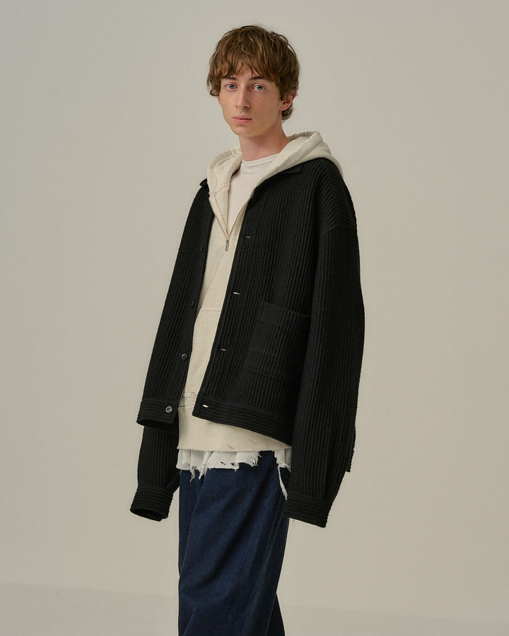柔らかな着心地と美しい落ち感を持たせるため生地はニットで製作。そこに加工で色を整え暖かみのある雰囲気に仕上げています。太畝コーデュロイによくあるごわつくような感じはなく、リラックスできる着心地も最高です。