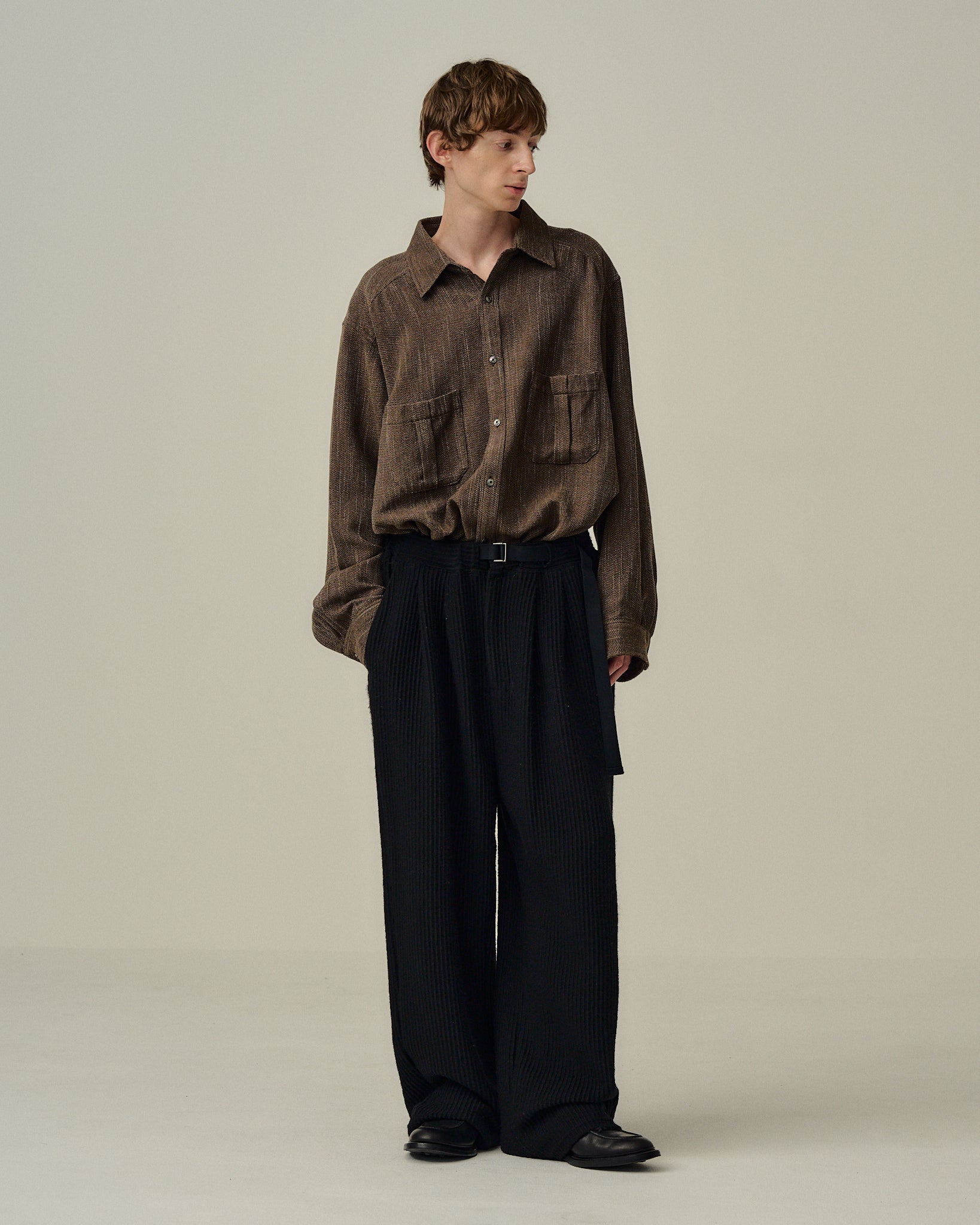 柔らかな着心地と美しい落ち感を持たせるため生地はニットで製作。そこに加工で色を整え暖かみのある雰囲気に仕上げています。太畝コーデュロイによくあるごわつくような感じはなく、リラックスできる着心地も最高です。