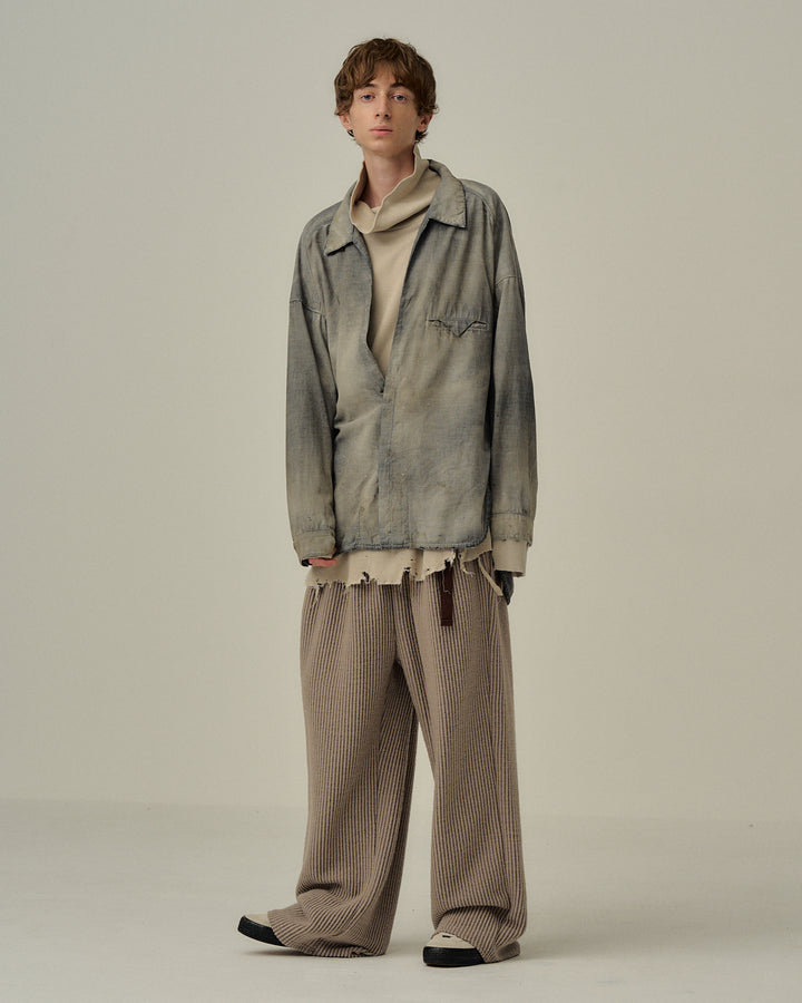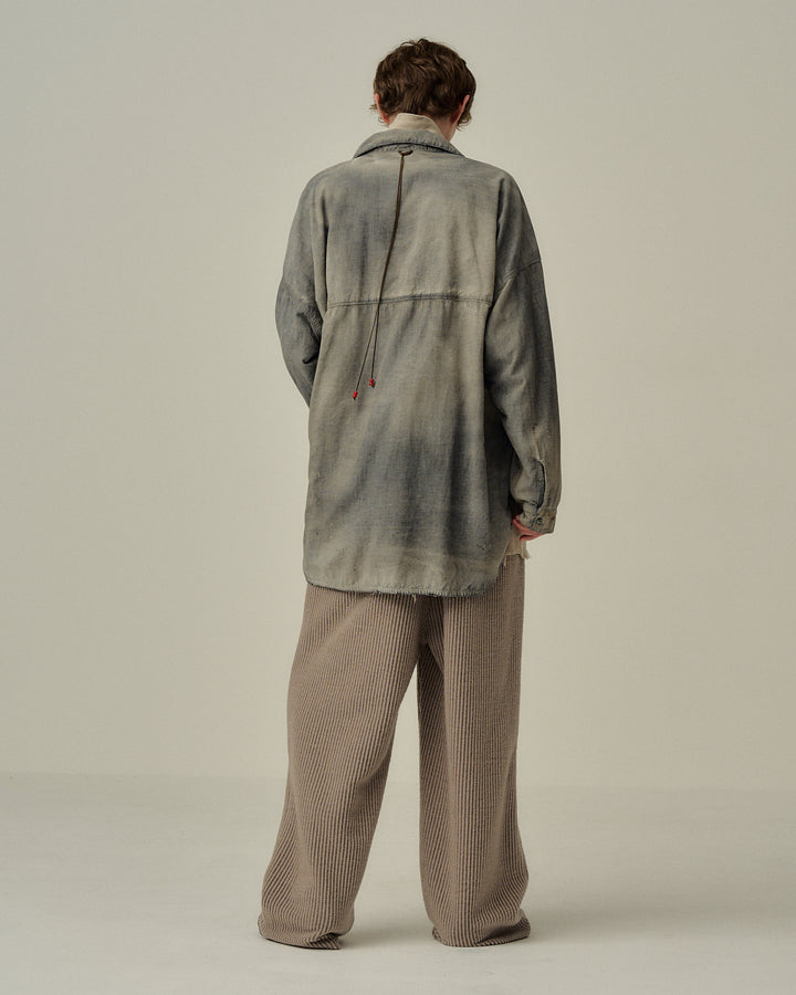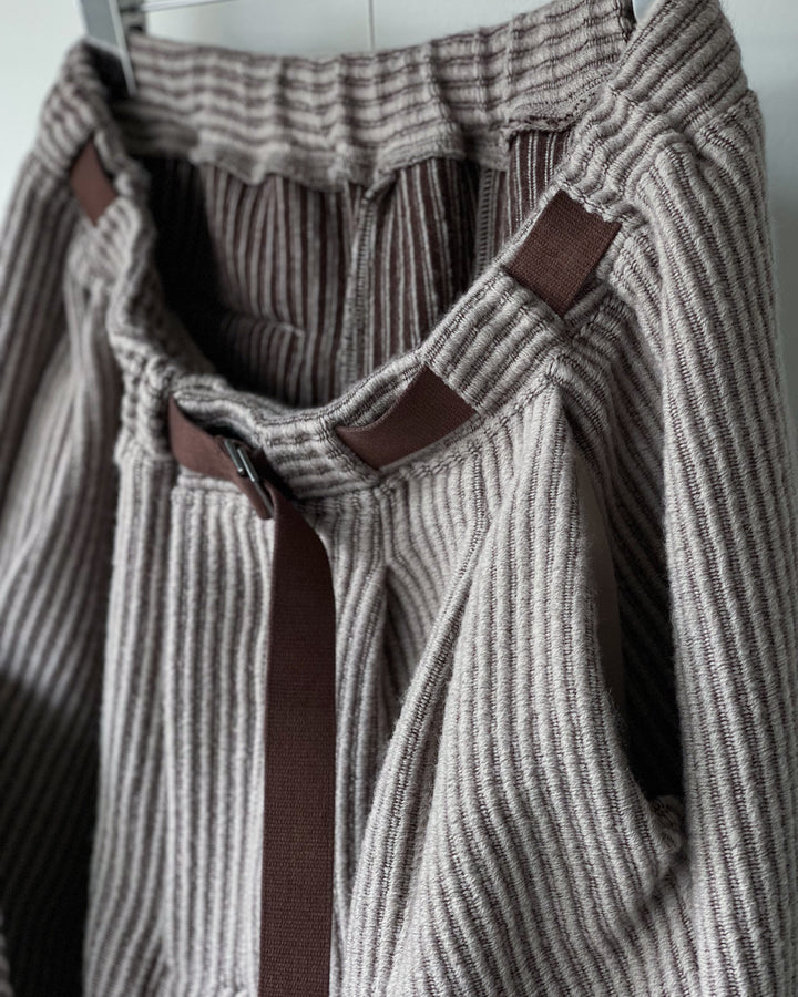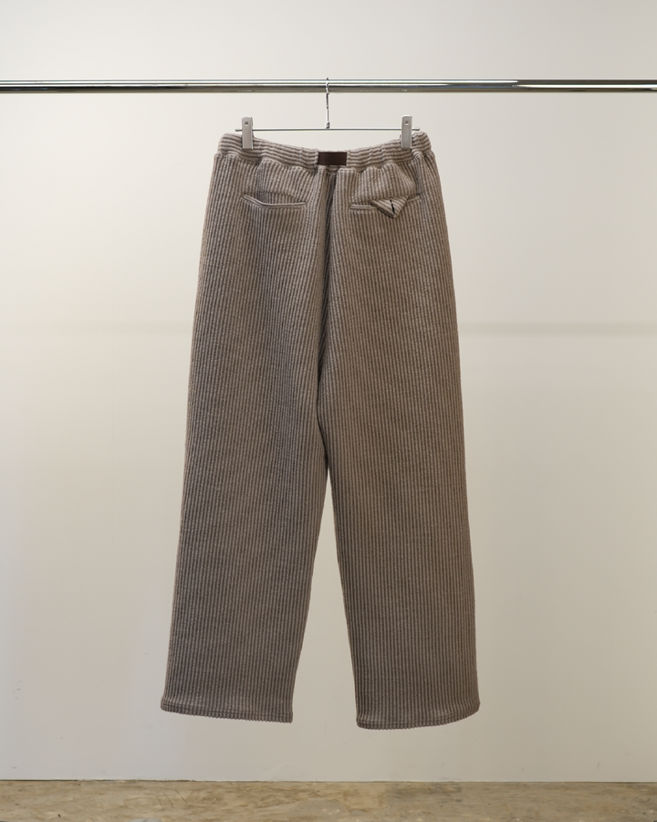 柔らかな着心地と美しい落ち感を持たせるため生地はニットで製作。そこに加工で色を整え暖かみのある雰囲気に仕上げています。太畝コーデュロイによくあるごわつくような感じはなく、リラックスできる着心地も最高です。