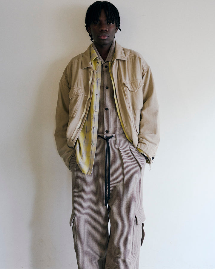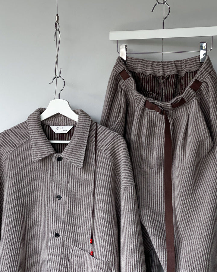 トップスはワークシャツ型ジャケット、パンツはベルトレスのイージースラックス。どちらもこの素材とてもマッチする型になってます。単体でもセットでもとても良いです。是非お試しください。